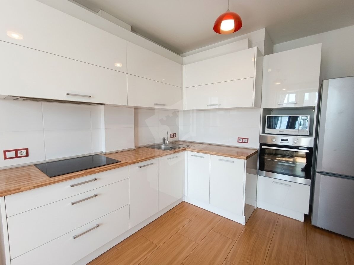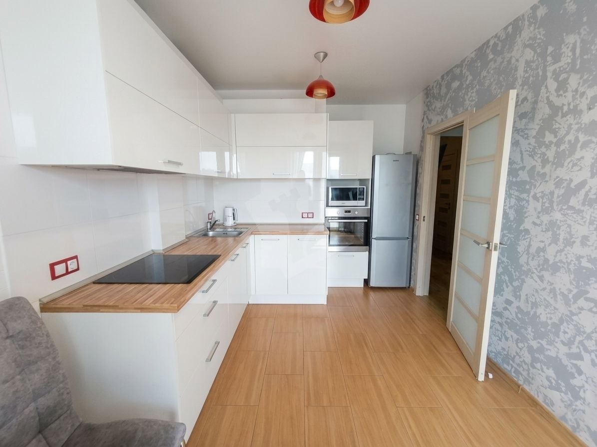 Кухня: Стильный белый гарнитур с глянцевыми фасадами. Оборудована современной техникой: варочная поверхность, духовой шкаф, микроволновая печь, холодильник.