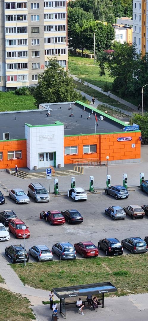 Напротив дома через проезжую часть магазин Хит и 6 станций для зарядки электромобилей.