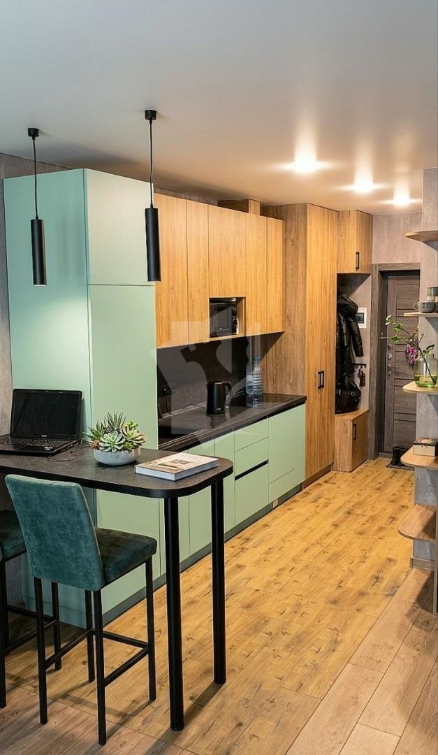 Грамотно разделенное пространство на зону отдыха с уютным изумрудным диваном и функциональную кухонную зону.