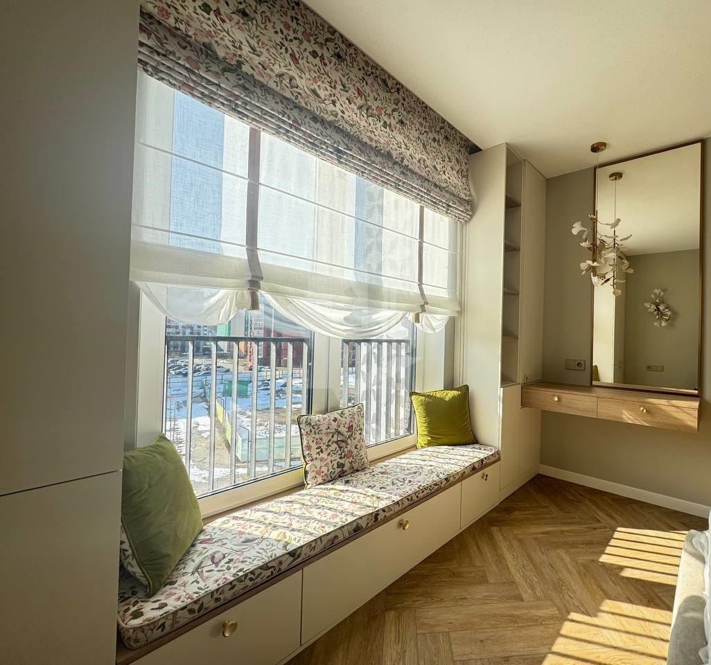 Спальня дооборудована зеркалом и подушками на окне для комфортного отдыха.