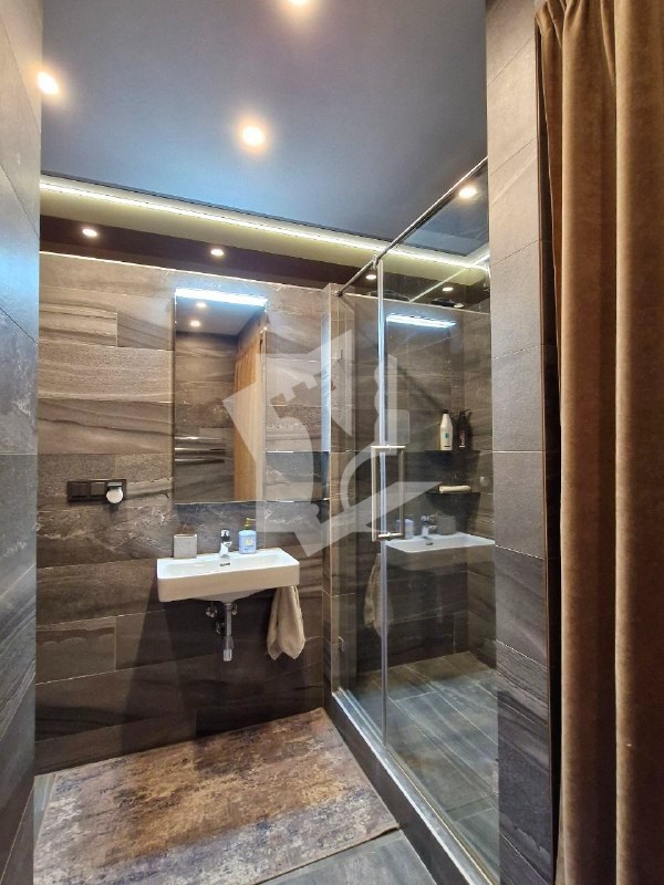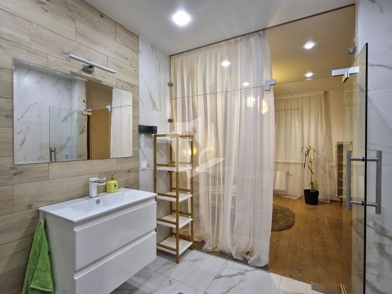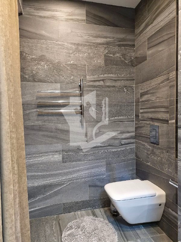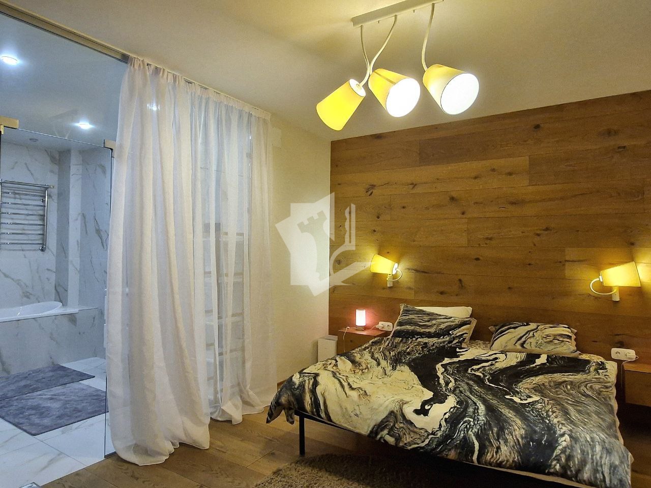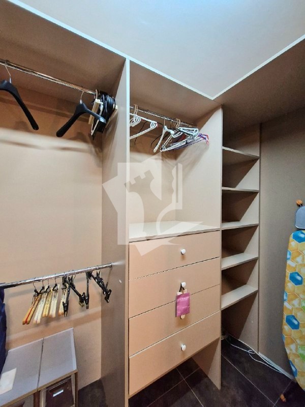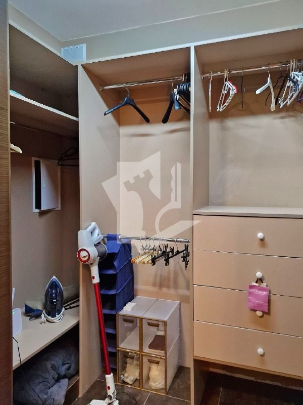 В квартире есть гардеробная, где удобно хранятся утюг и пылесос, гостевой санузел с просторной душевой кабиной и стиральной машиной, а основной санузел, отделенный от спальни прозрачной перегородкой, с ванной для полного расслабления после долгого дня.