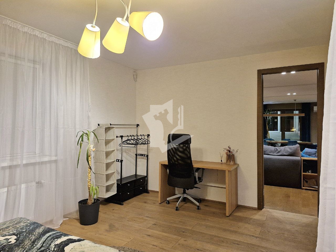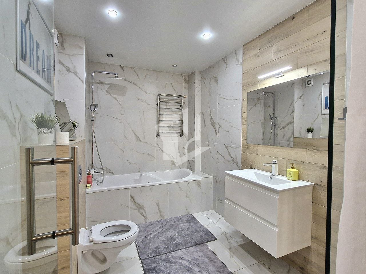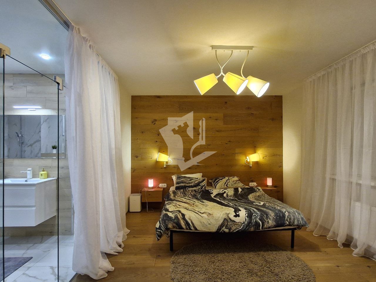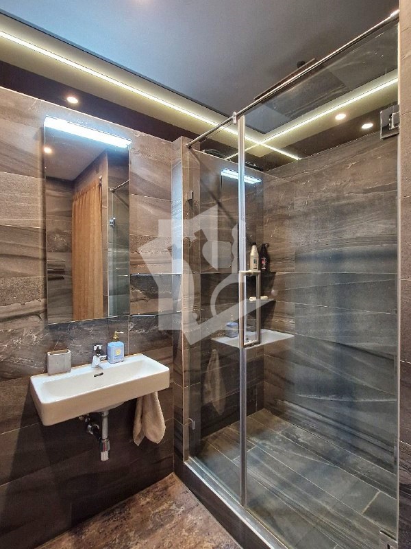 В квартире есть гардеробная, где удобно хранятся утюг и пылесос, гостевой санузел с просторной душевой кабиной и стиральной машиной, а основной санузел, отделенный от спальни прозрачной перегородкой, с ванной для полного расслабления после долгого дня.