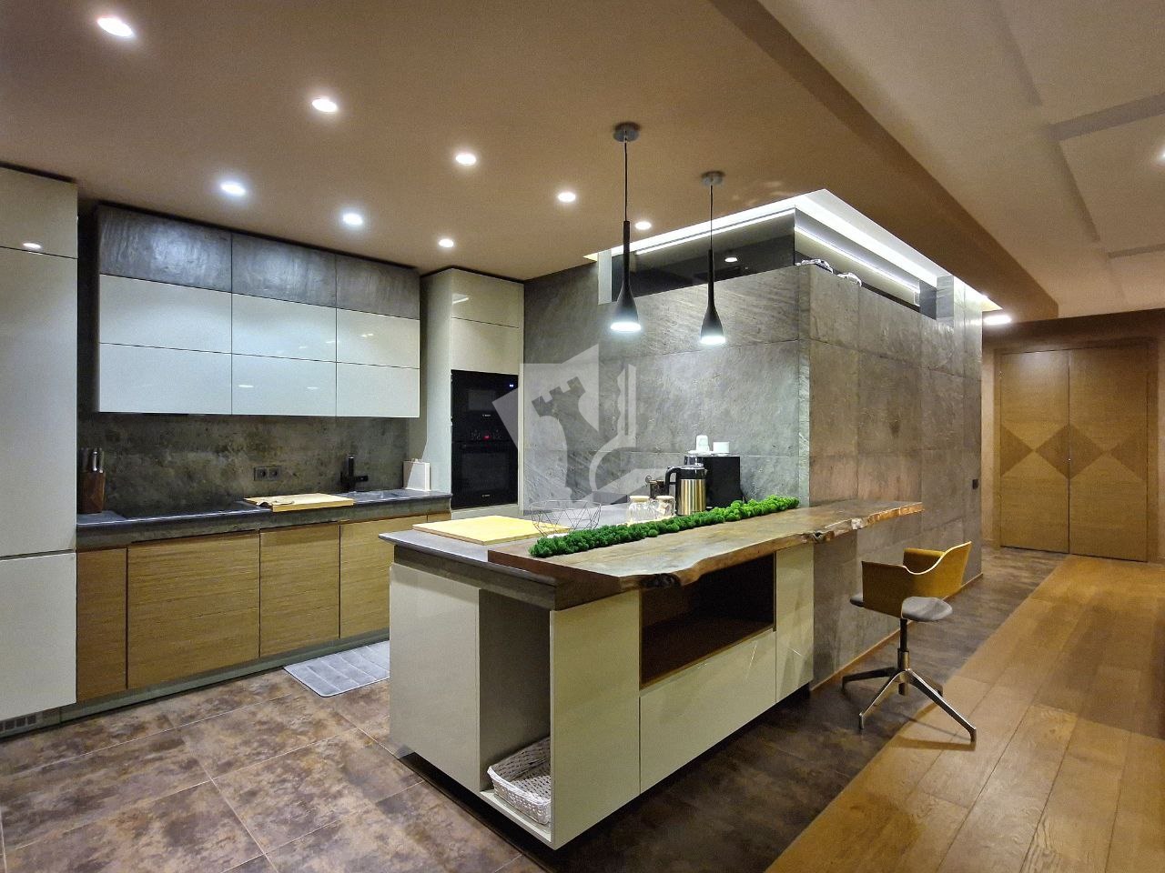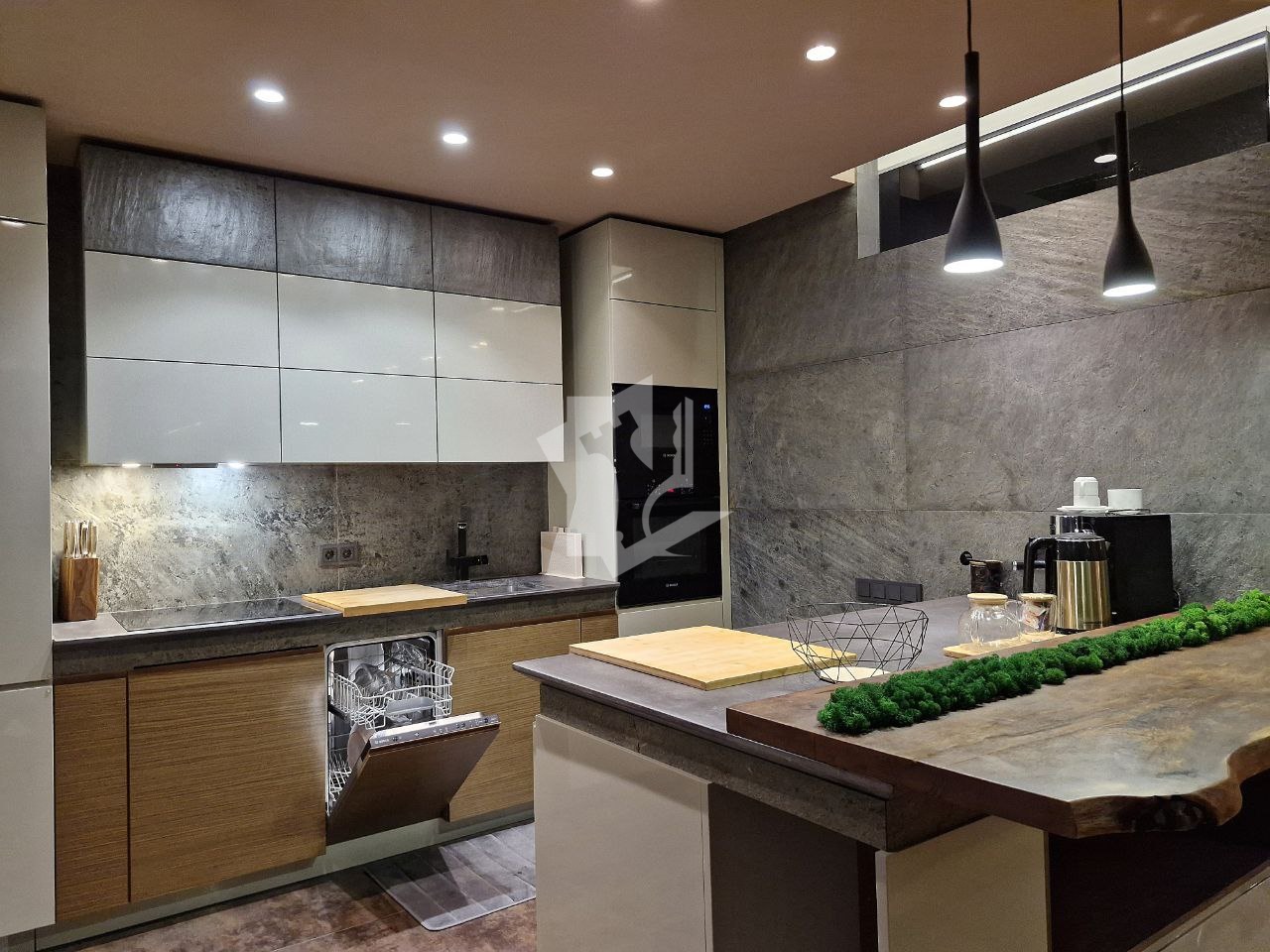 Зайдя в эту квартиру, вы сразу почувствуете гармонию дерева и камня, теплые натуральные текстуры создают атмосферу уюта и спокойствия. Барная стойка и обеденный стол из цельного среза дерева с эпоксидной смолой не только функциональны, но и настоящие арт-объекты, добавляющие интерьеру характер и уникальность.