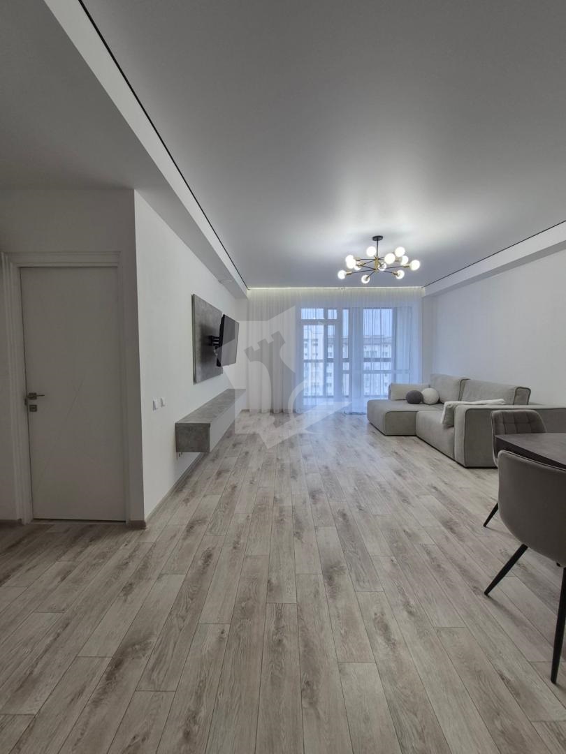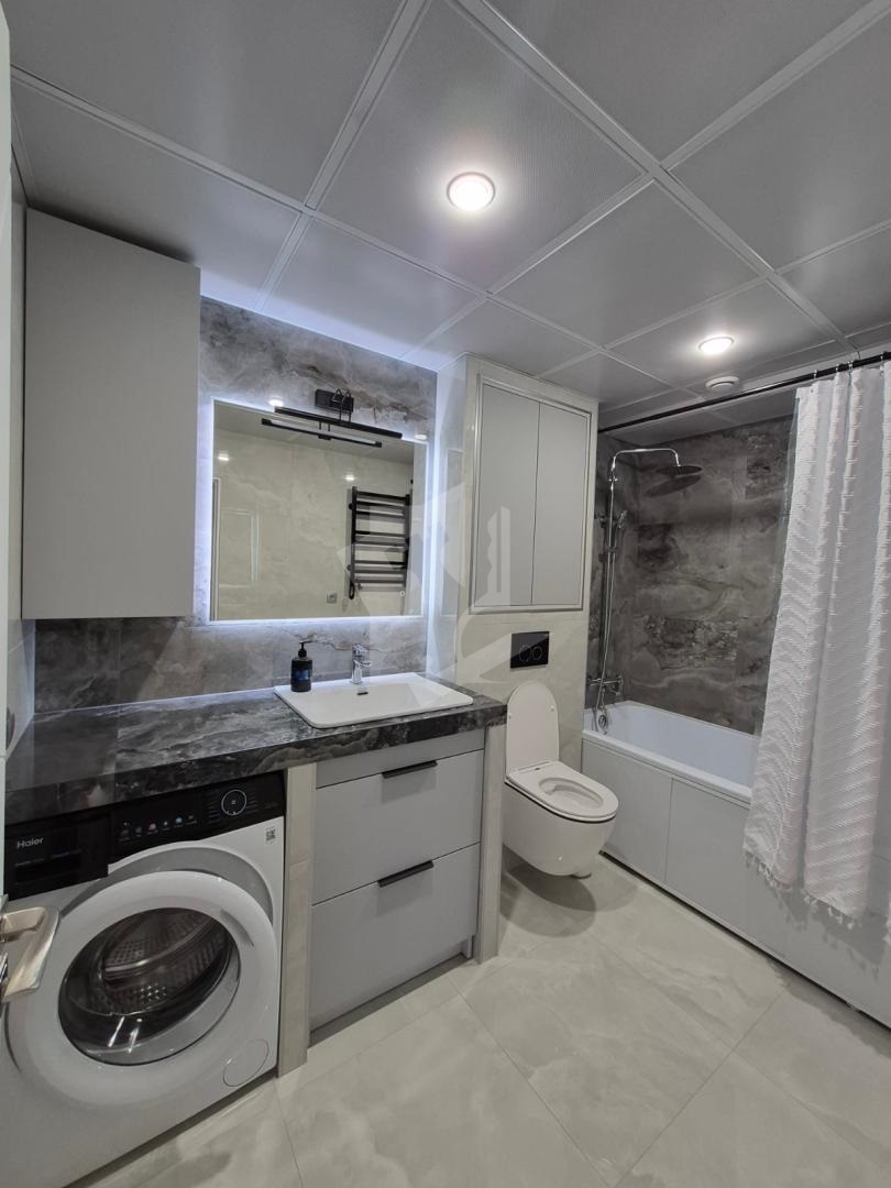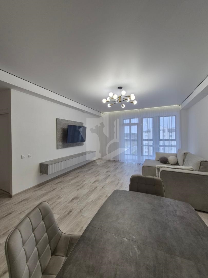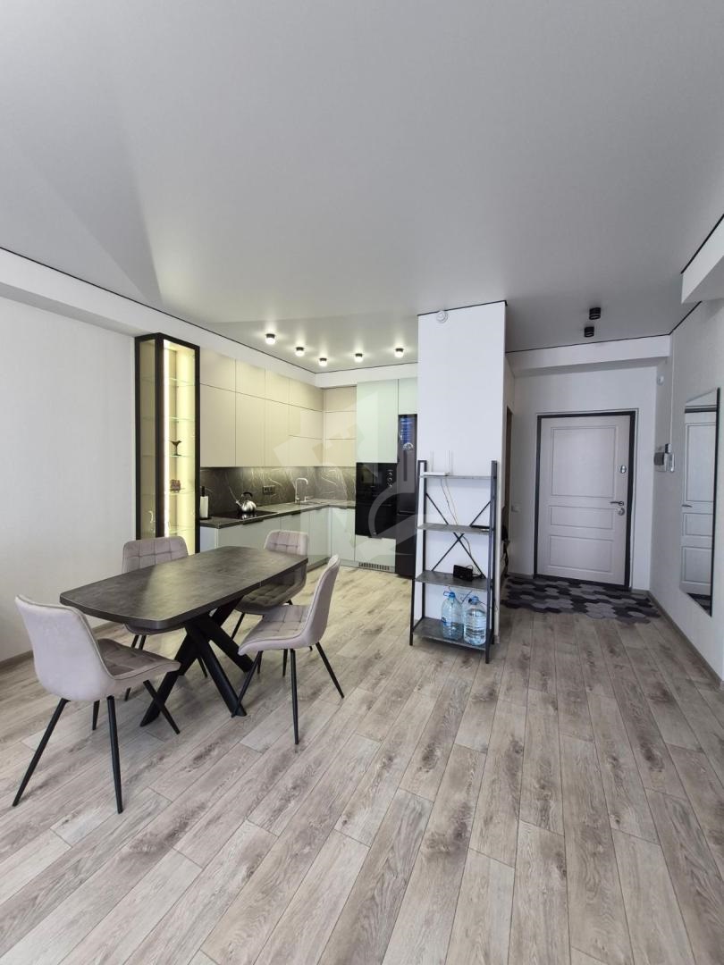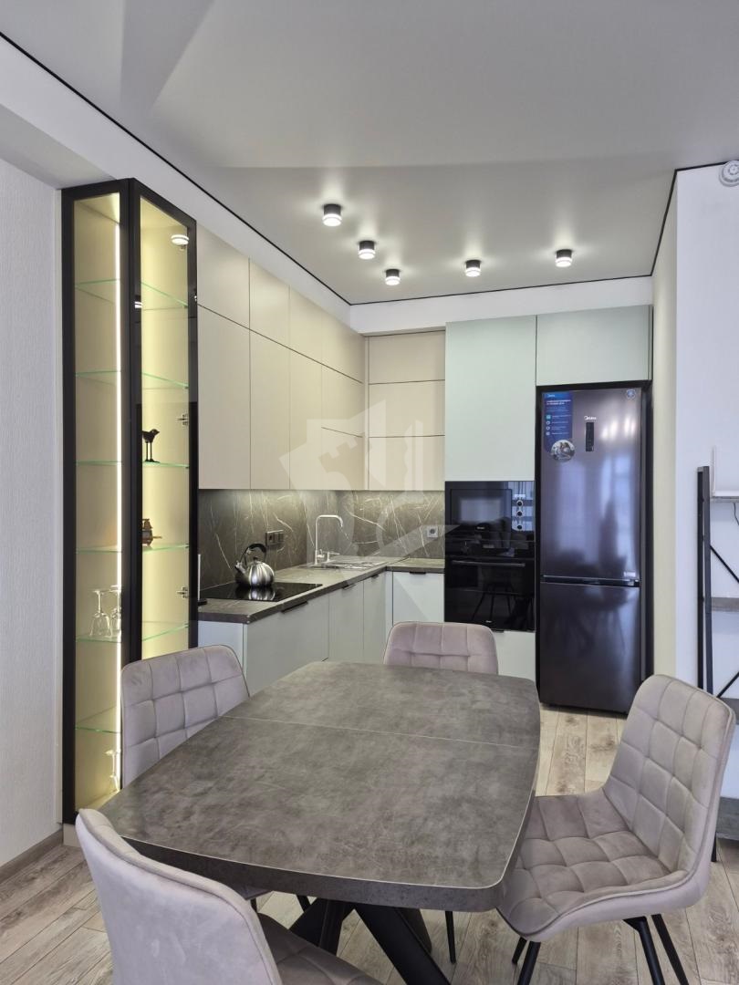 Жилая зона с кухней: просторная комната с кухонным гарнитуром и современной техникой — варочная панель, духовой шкаф, микроволновая печь, посудомоечная машина и холодильник. В гостиной установлен SMART TV для вашего комфорта.