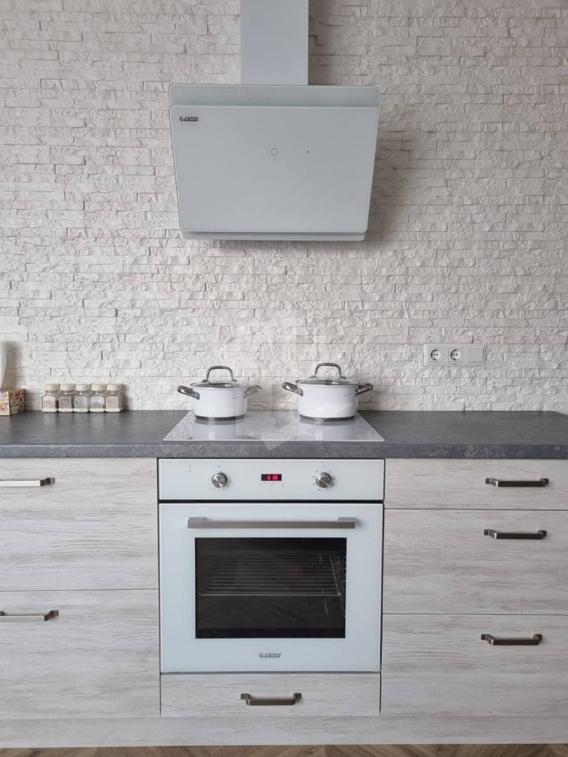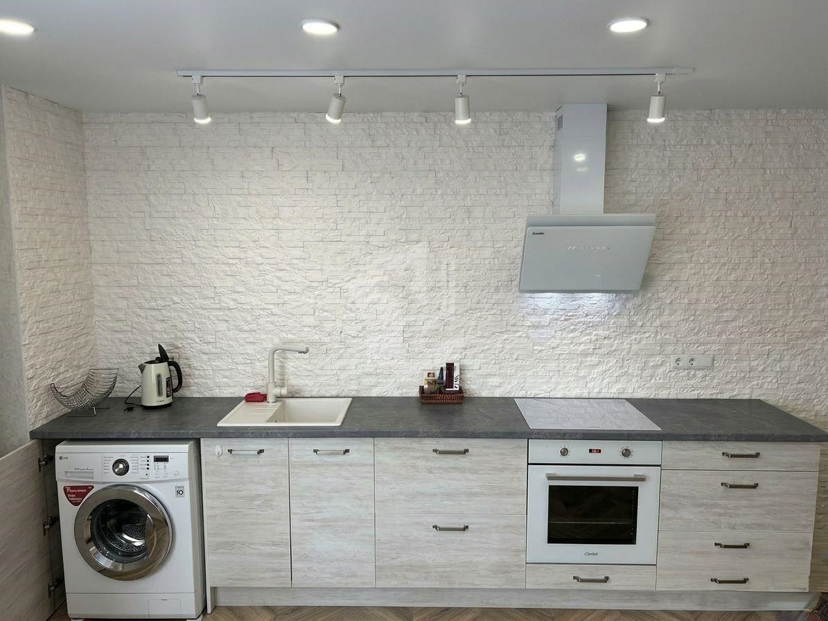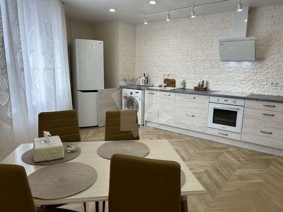 Кухня-гостиная: Просторная кухонная зона с белоснежными фасадами и встроенной техникой (варочная панель, духовой шкаф, вытяжка). Установлена стиральная машина. Обеденная группа с мягкими стульями идеально подходит как для завтраков, так и для работы за ноутбуком.