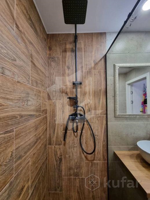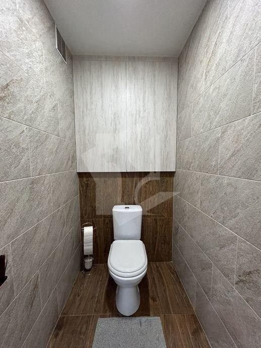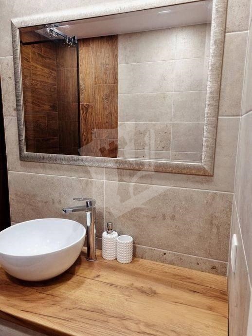 Санузел: Раздельный, с современной душевой системой «тропический дождь» и стильной накладной раковиной-чашей. Отделка плиткой под дерево и натуральный камень.