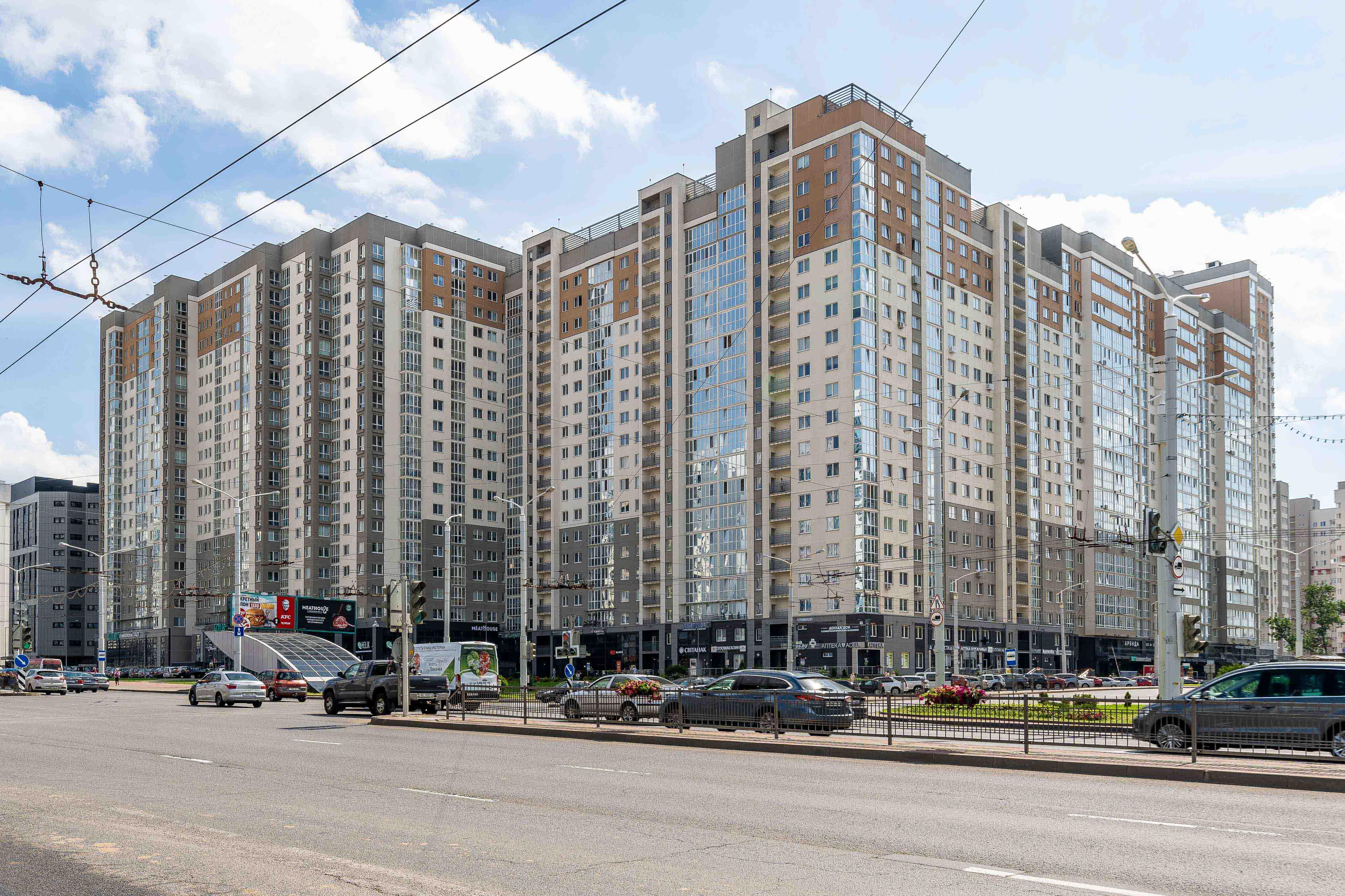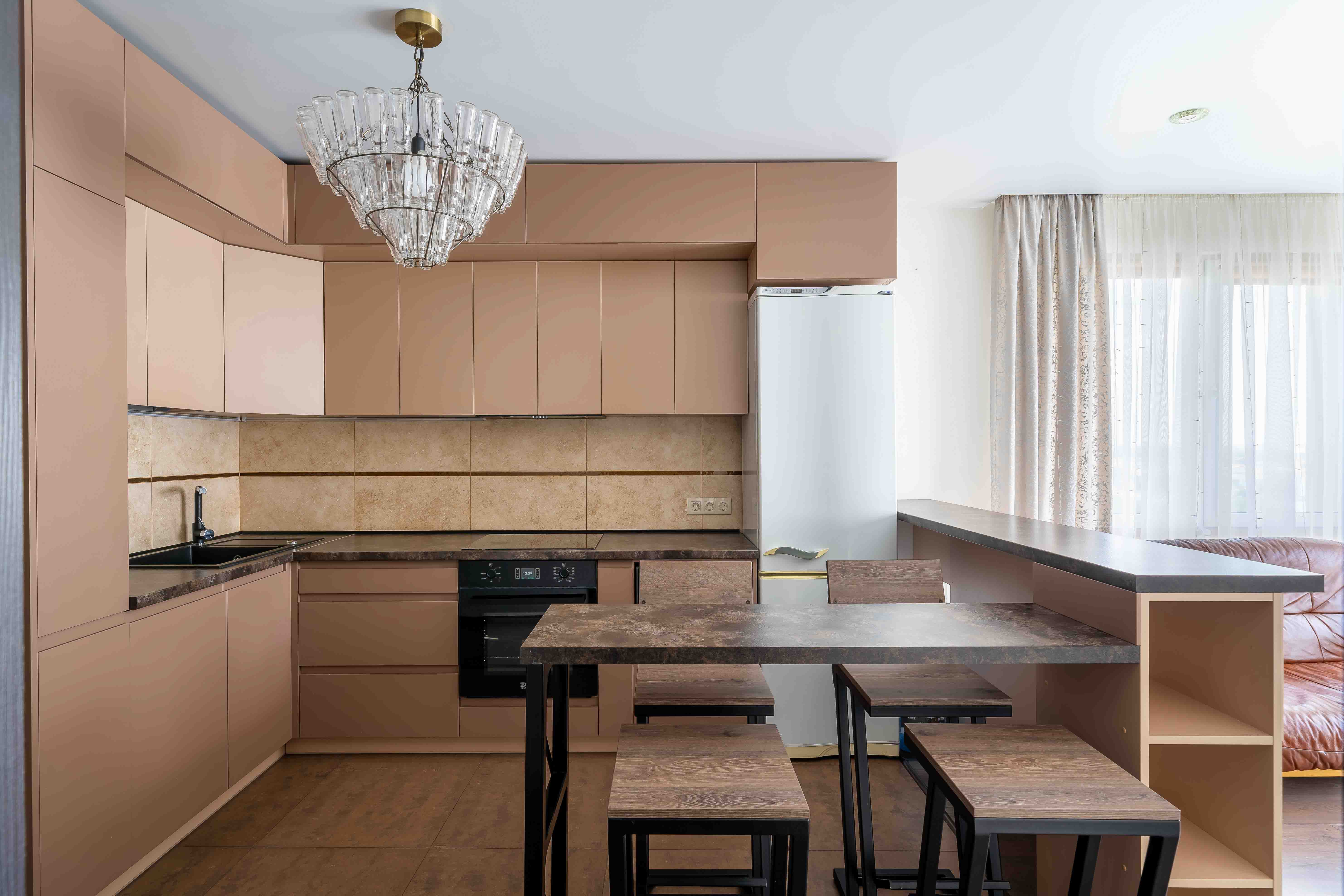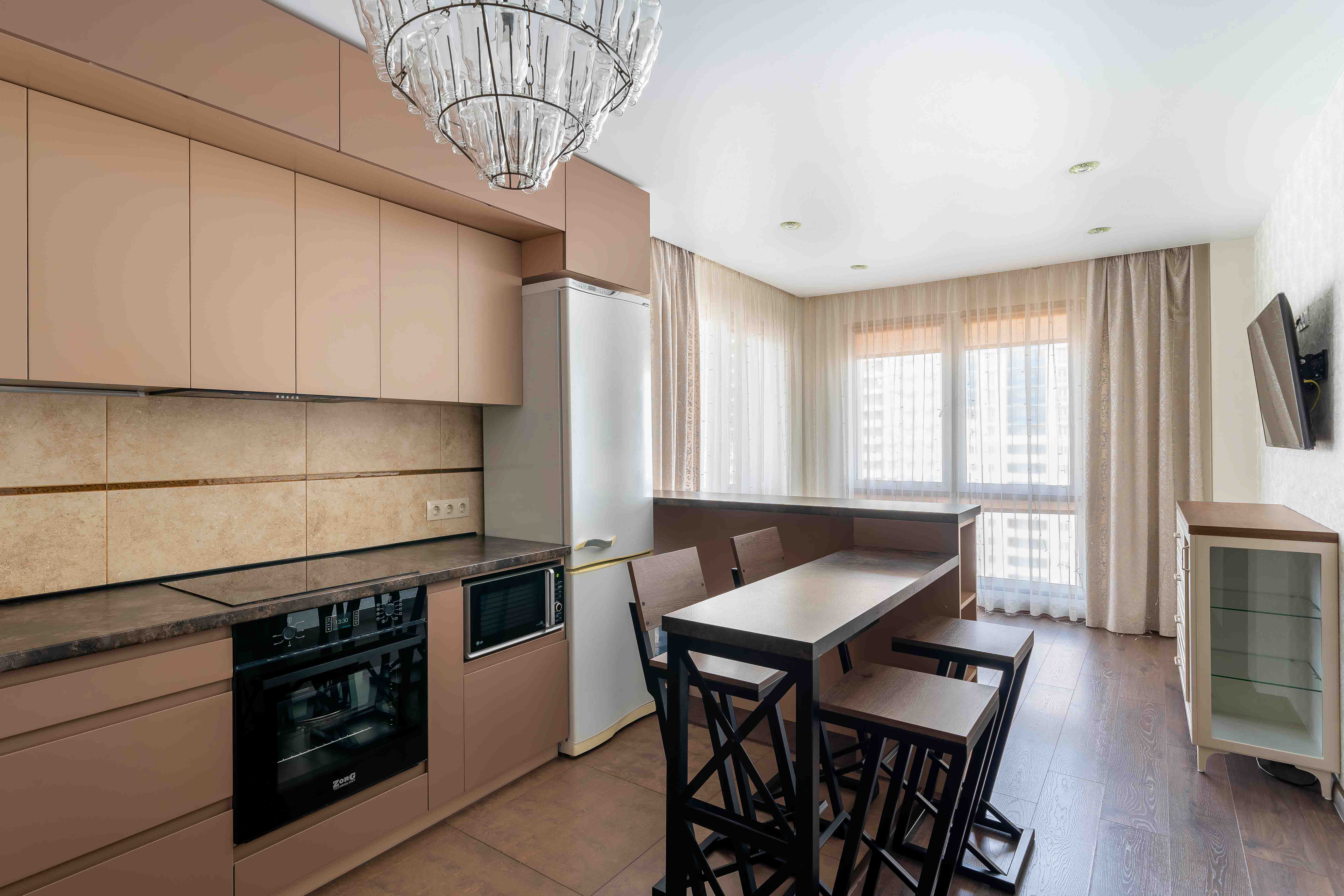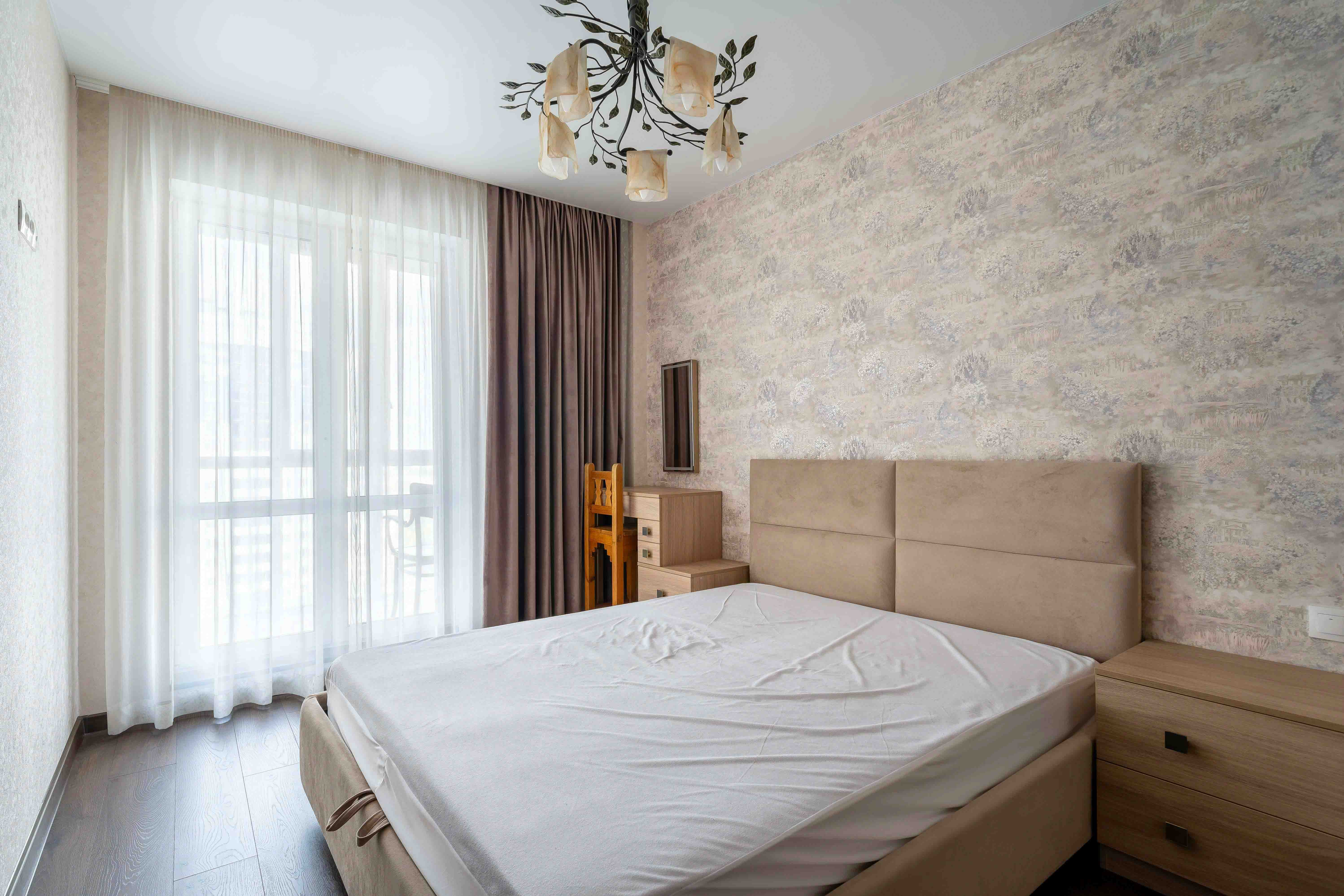 Сдается евротрешка у метро Грушевка. 70 квадратных метров. 2 изолированные комнаты, кухня-гостиная с панорамным видом на проспект Дзержинского.