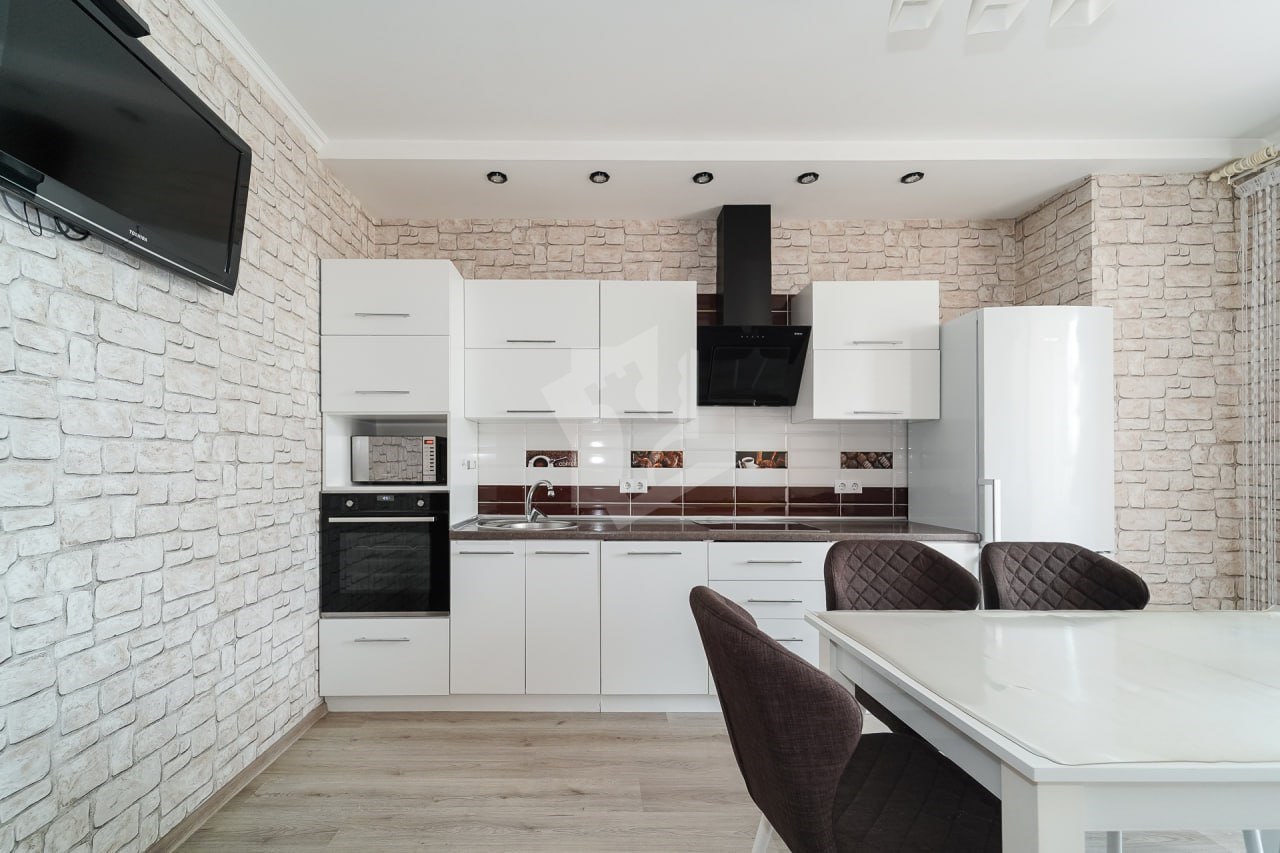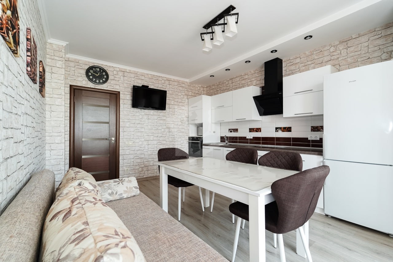 Большая кухня с обеденным столом, диваном, просторная светлая спальня с большой кроватью.