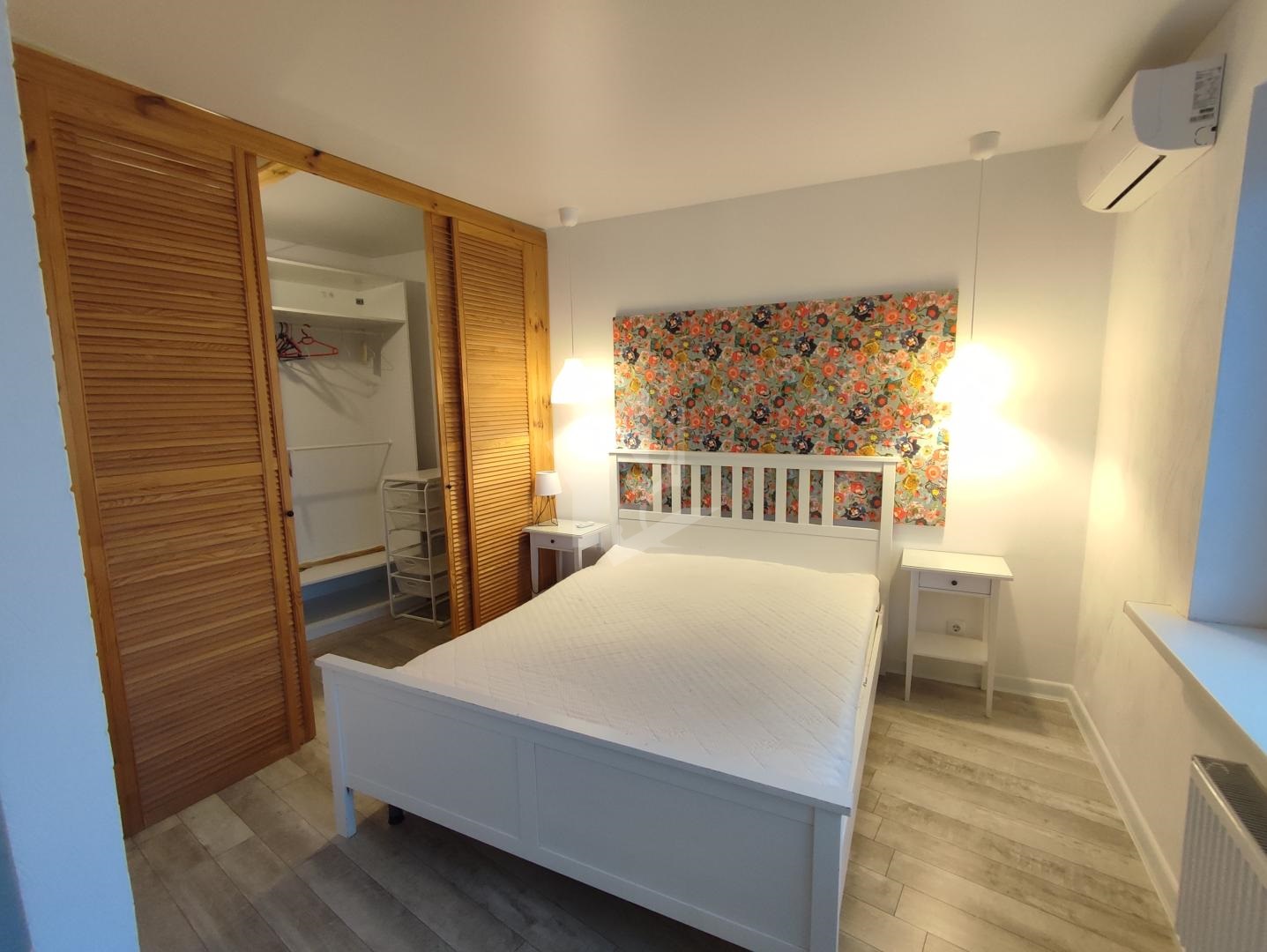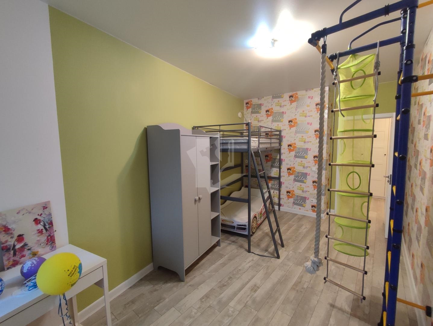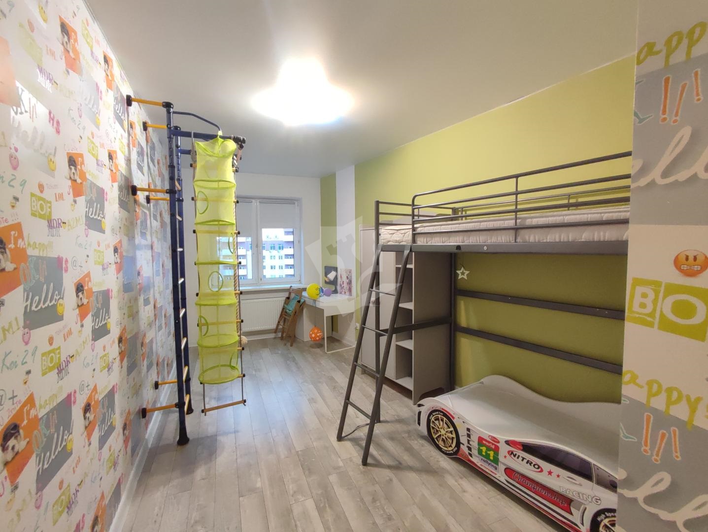 В спальной комнате отдельная гардеробная, двуспальная кровать. Детская комната оборудована двумя детскими кроватями, столиком и детским спортивным комплексом.