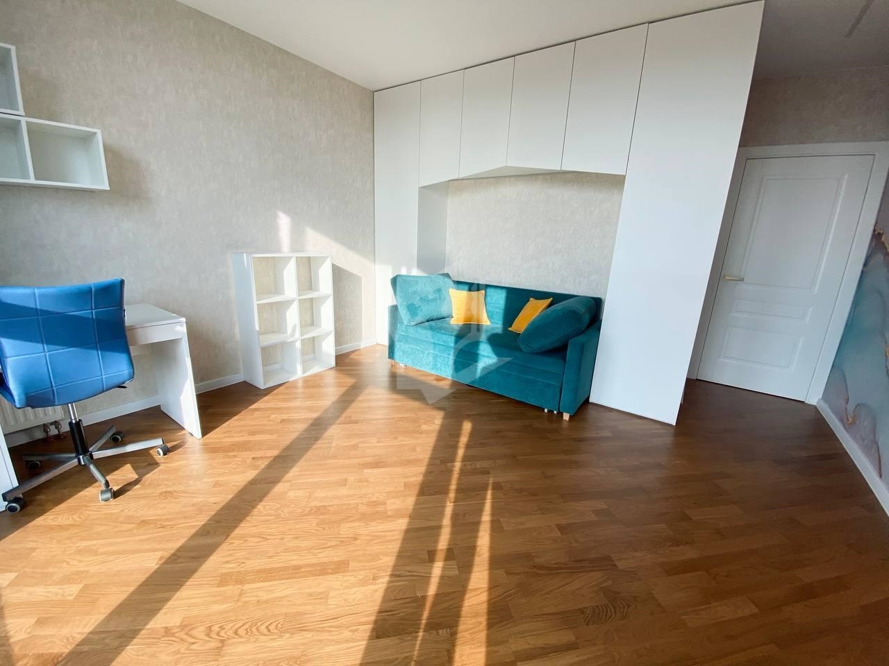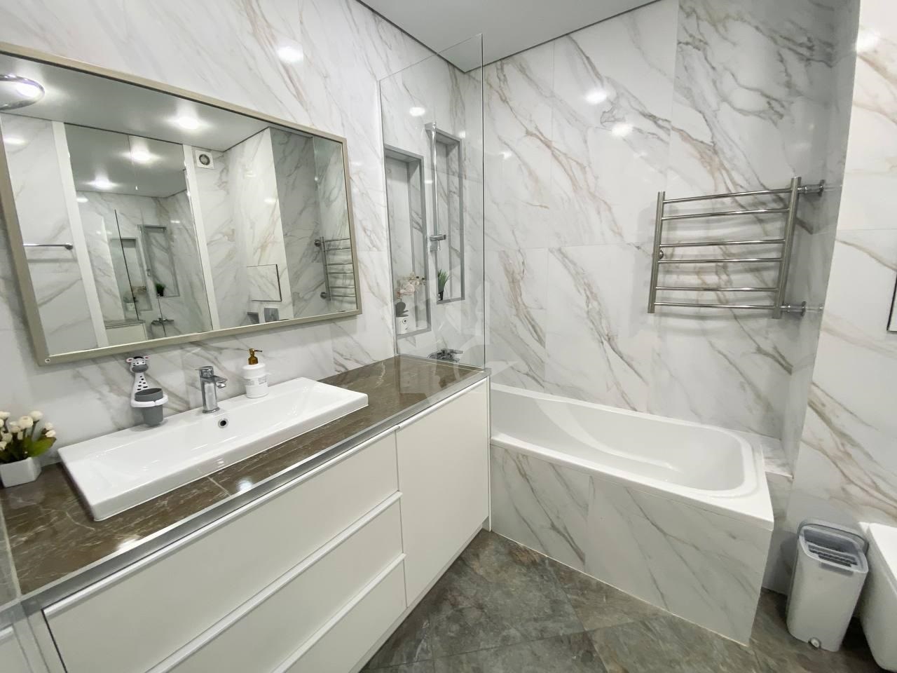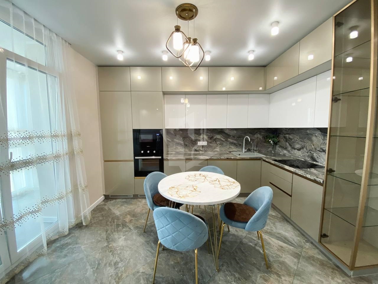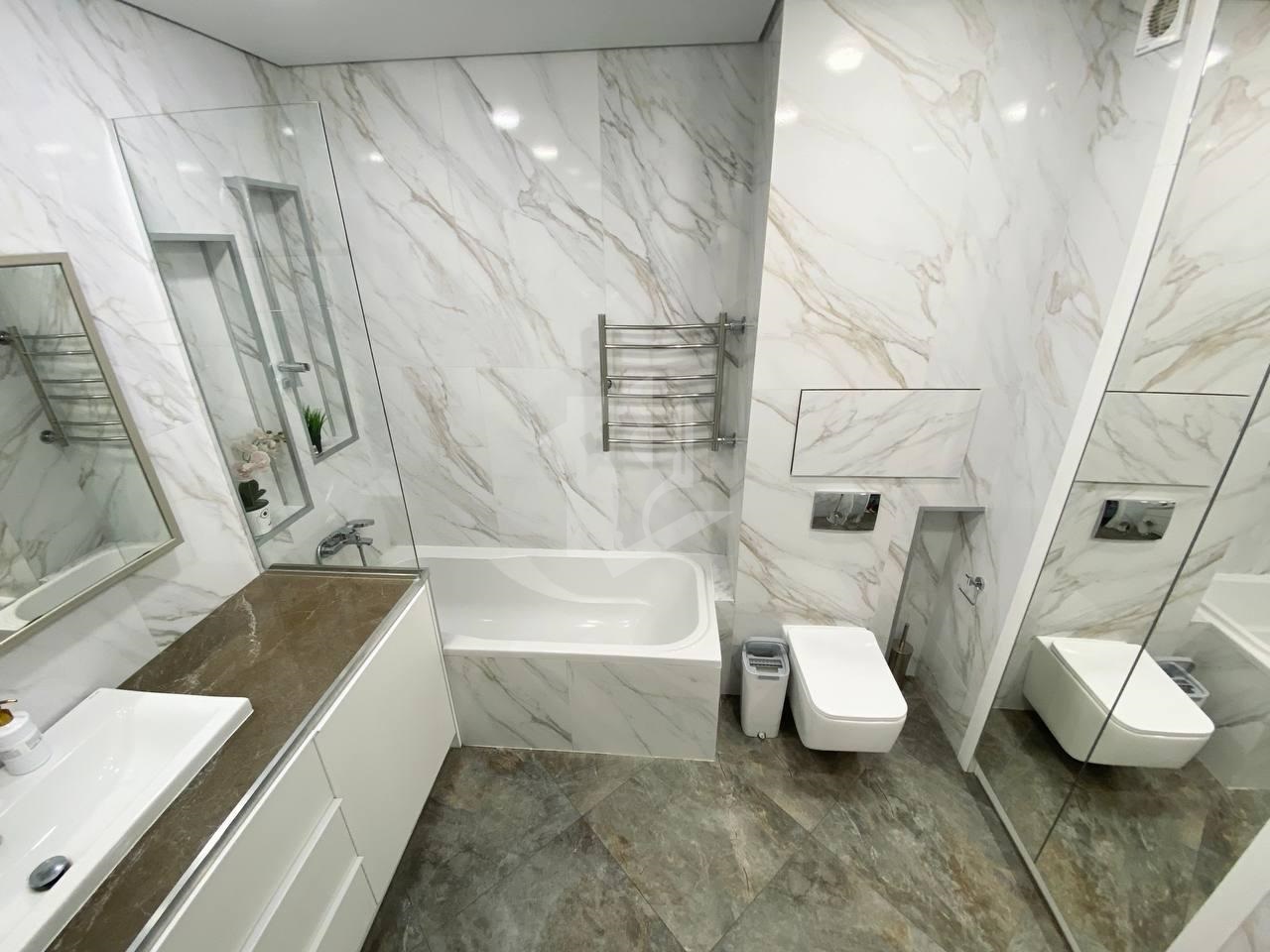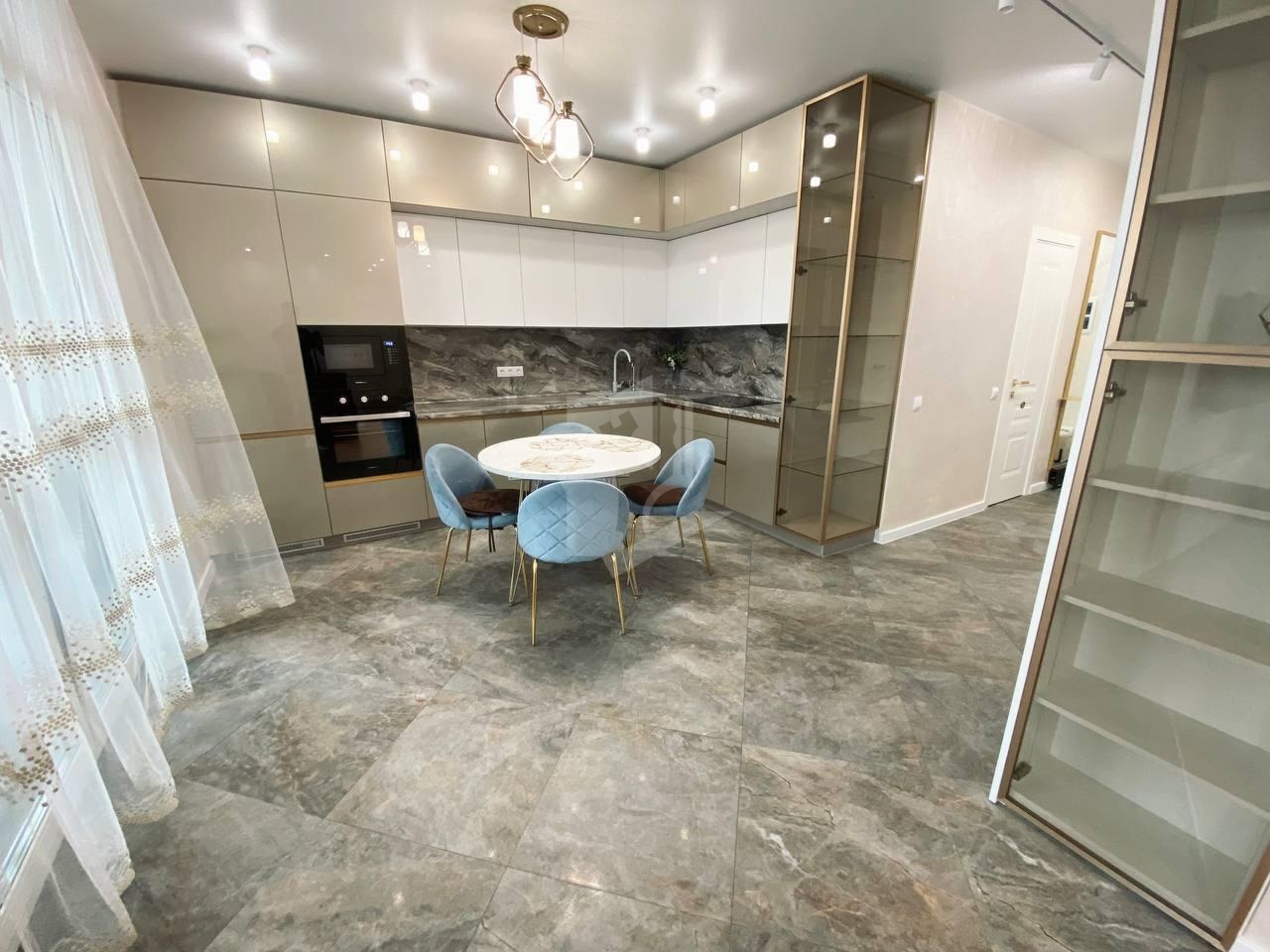 Общая площадь квартиры по СНБ более 77 м2. В квартире выполнен качественный ремонт с использованием дорогостоящих материалов. Кухня совмещена с гостиной, а также имеются две раздельные комнаты, которые оборудованы всем необходимым для комфортного проживания.