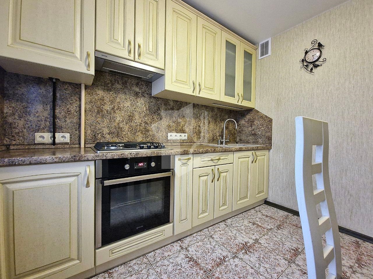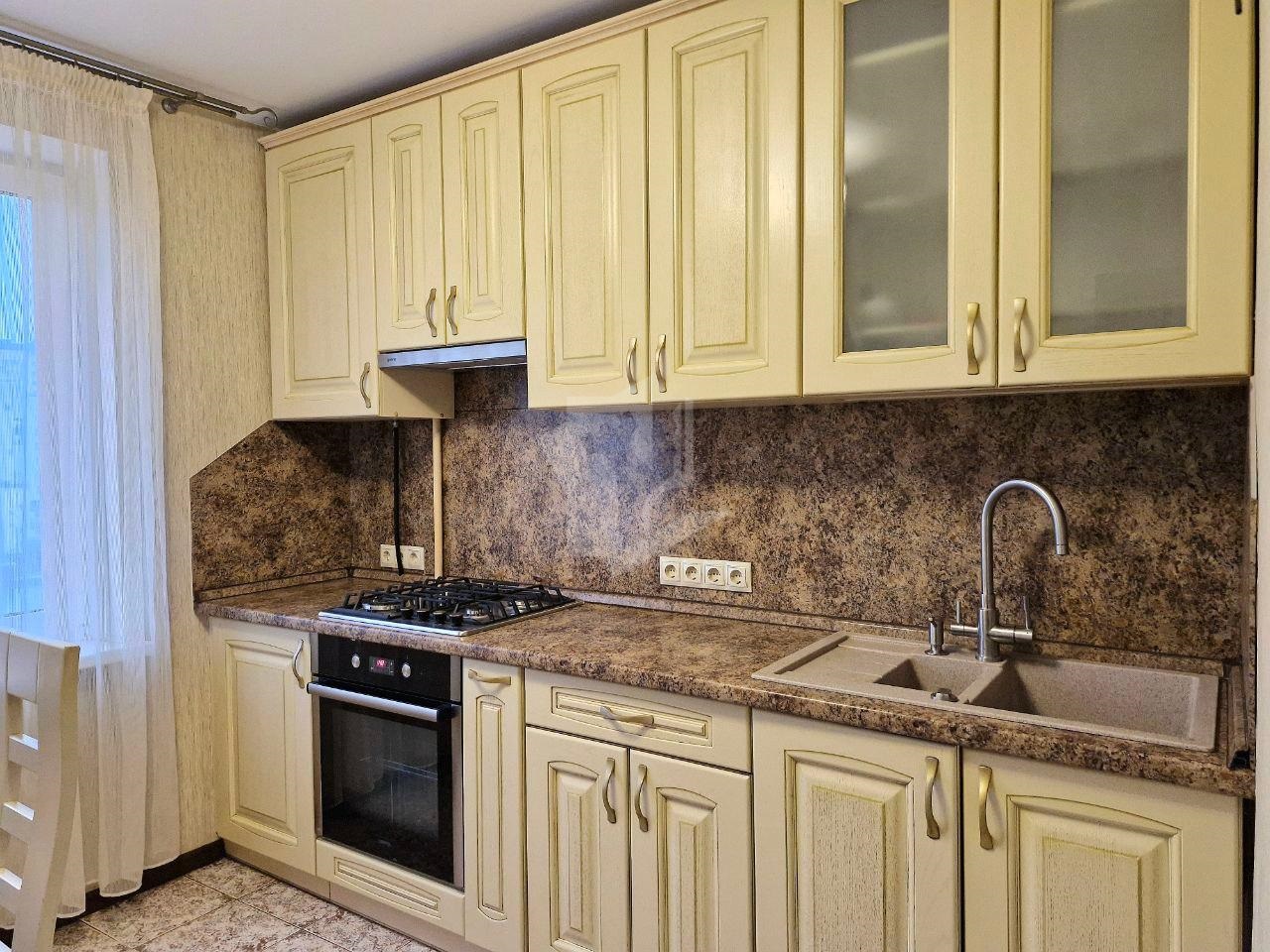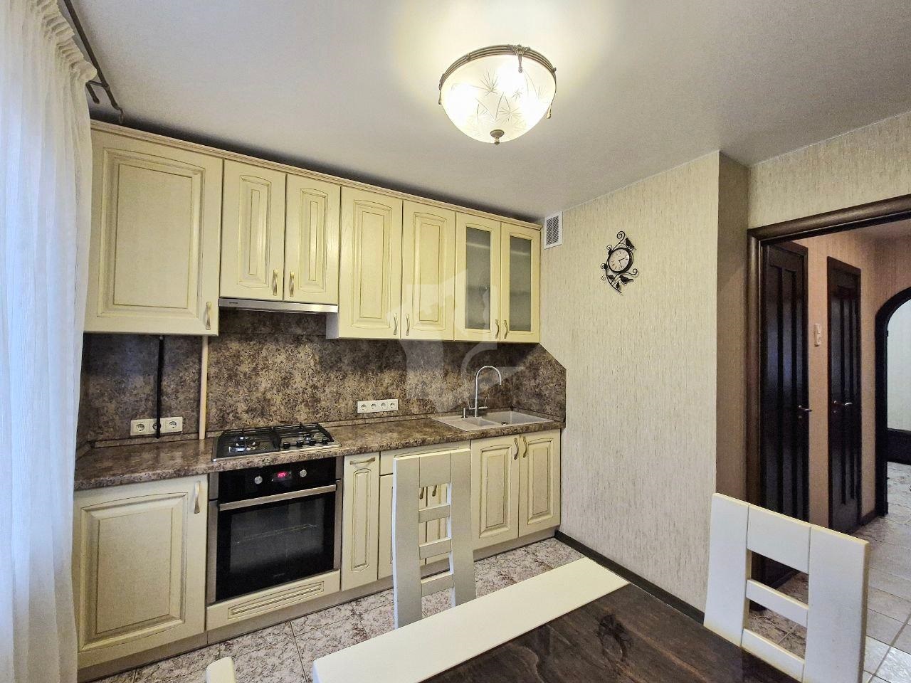 Просторная кухня, полностью оборудованная всей необходимой техникой: варочная панель, духовой шкаф, вытяжка, холодильник, фильтр для воды с обратным осмосом.