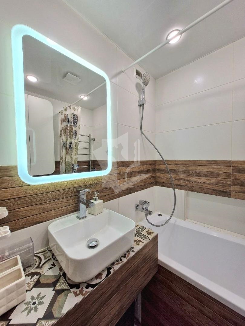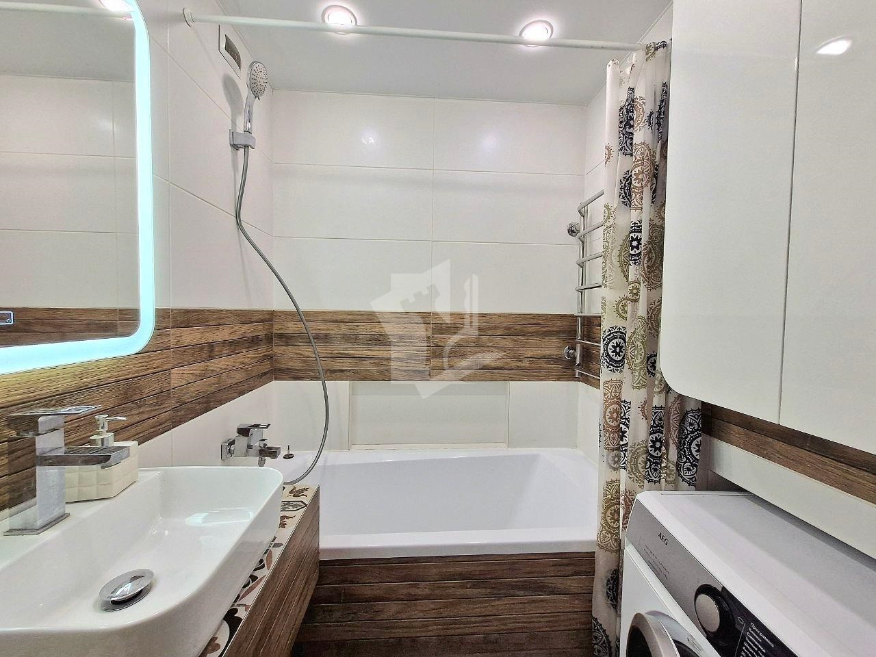 Раздельный санузел с современной сантехникой, акриловая ванна, стиральная машина AEG, подсветка зеркала, тёплые полы, бойлер и фильтры воды — всё продумано для вашего удобства каждый день.