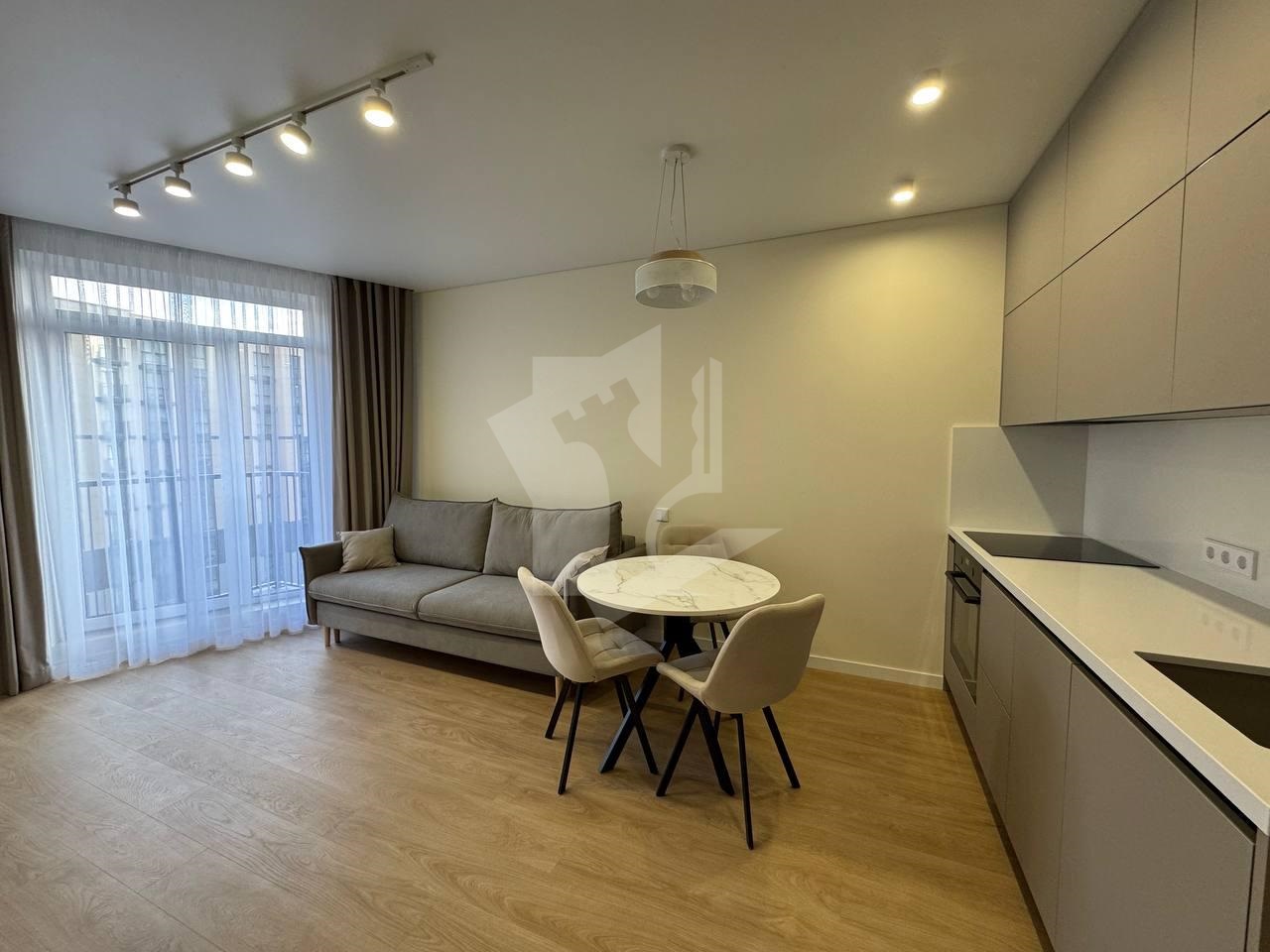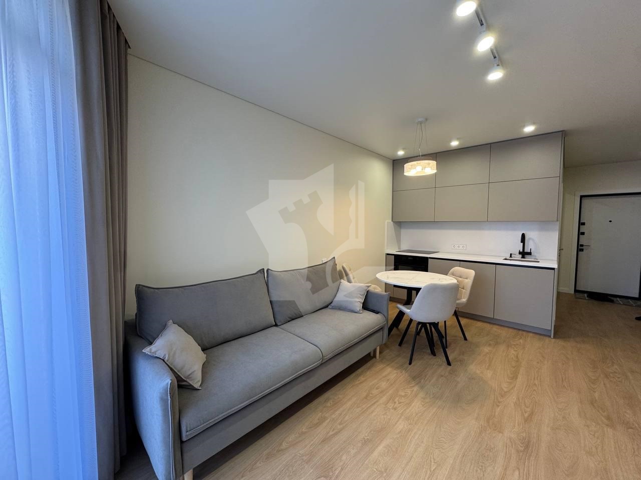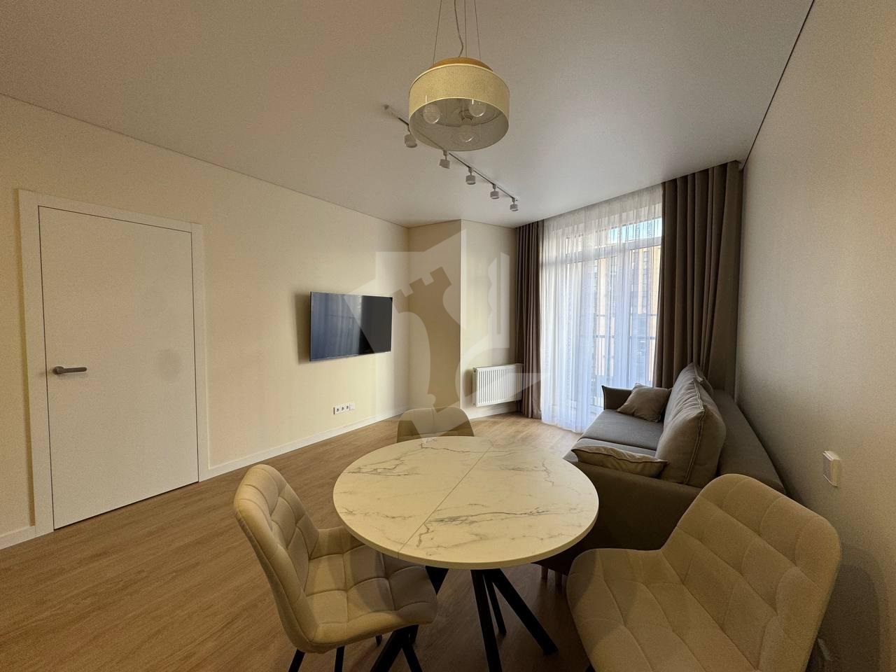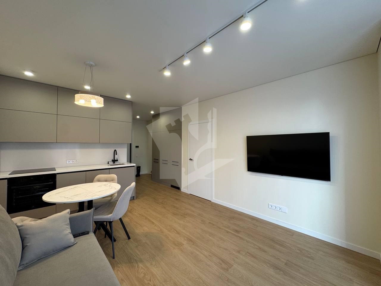 Гостиная с кухонным оборудованием укомплектована современным телевизором с ИИ , раскладным диваном и раздвижным столом с 3 стульями .