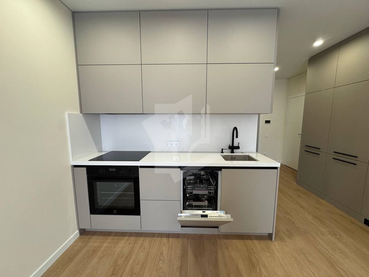 Вся техника — варочная панель, духовой шкаф, посудомоечная машина, холодильник и сушильно-стиральная машина — в комплекте.