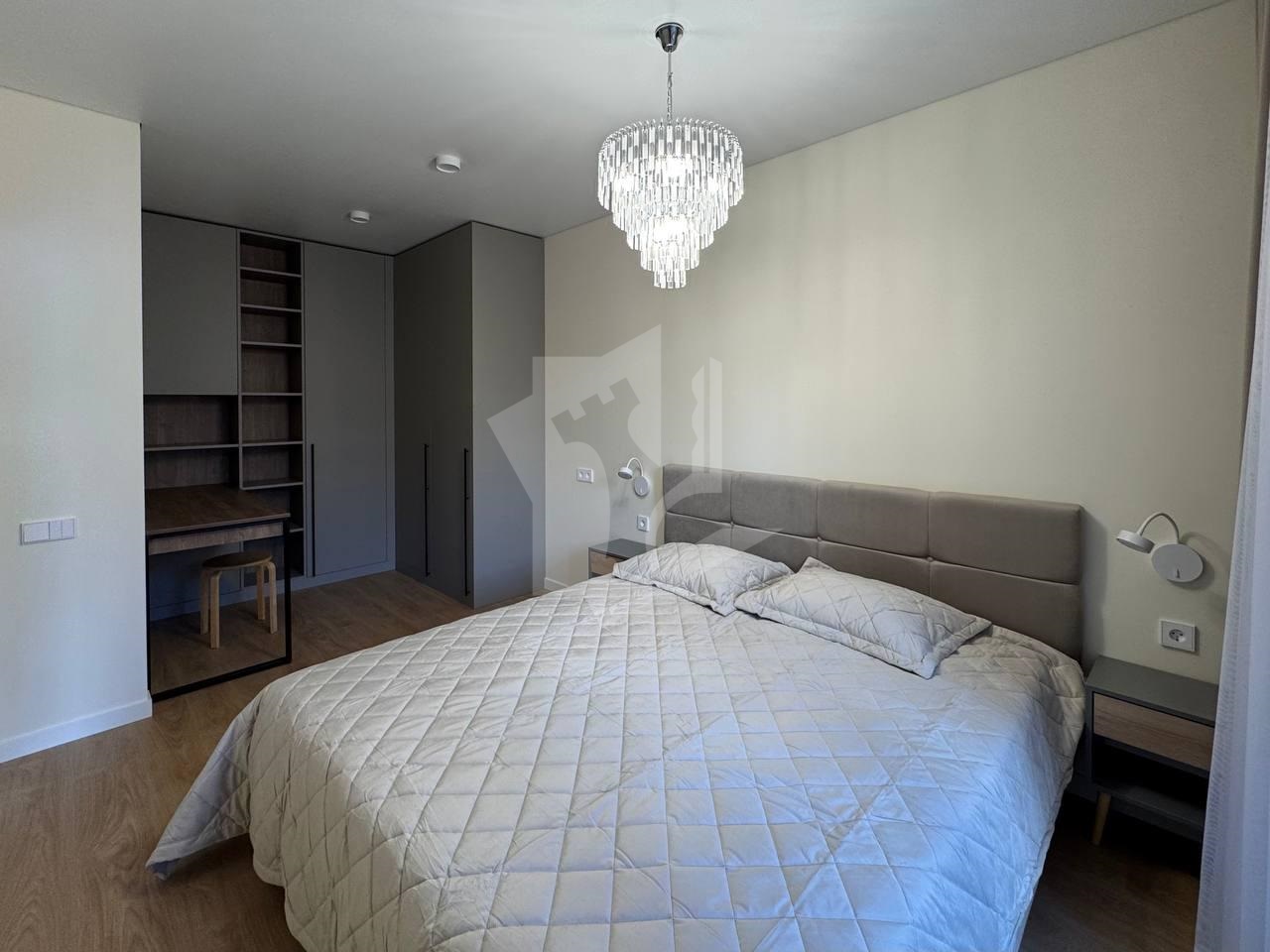 В спальне установлен встроенный стол — идеальное место для работы или хобби. Большая двуспальная кровать 1.80*2.00, 2 прикроватные тумбочки .