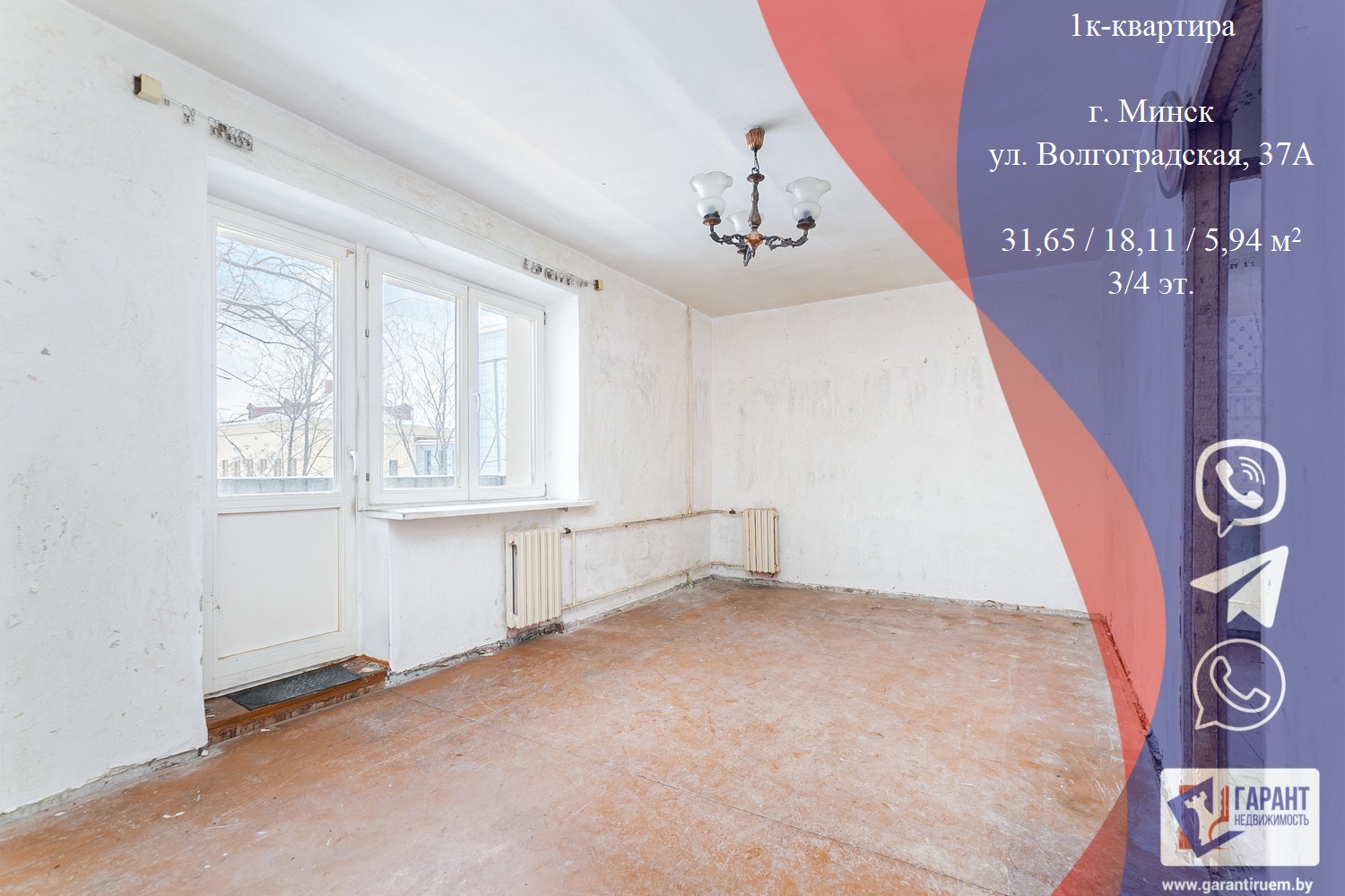 Однокомнатная квартира по ул. Волгоградская, д.37А, Первомайского района г. Минска, расположена на третьем этаже четырехэтажного жилого дома. Общая площадь квартиры 31,65 кв.м., жилая комната - 18,11 кв.м., кухня - 5,94 кв.м..