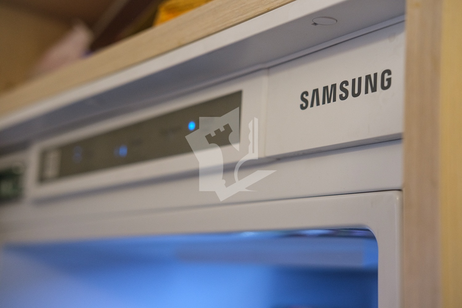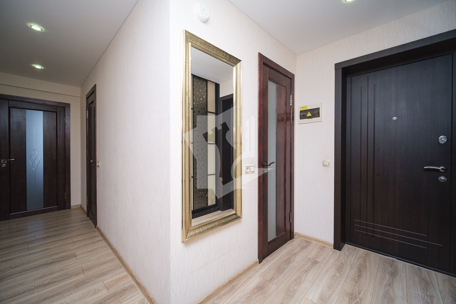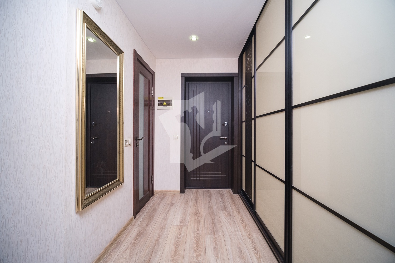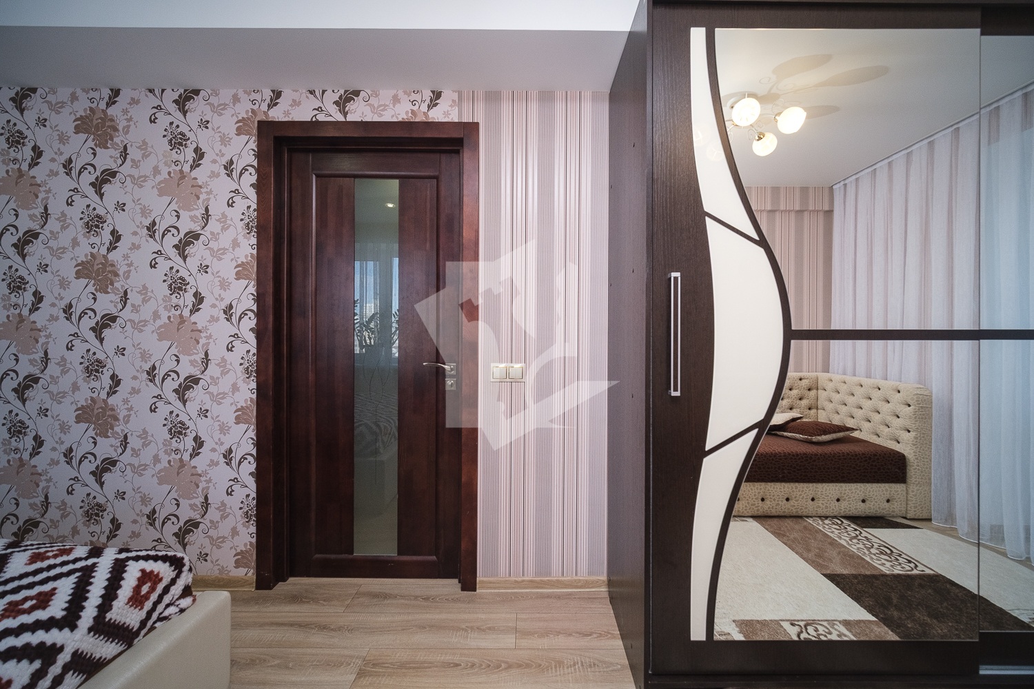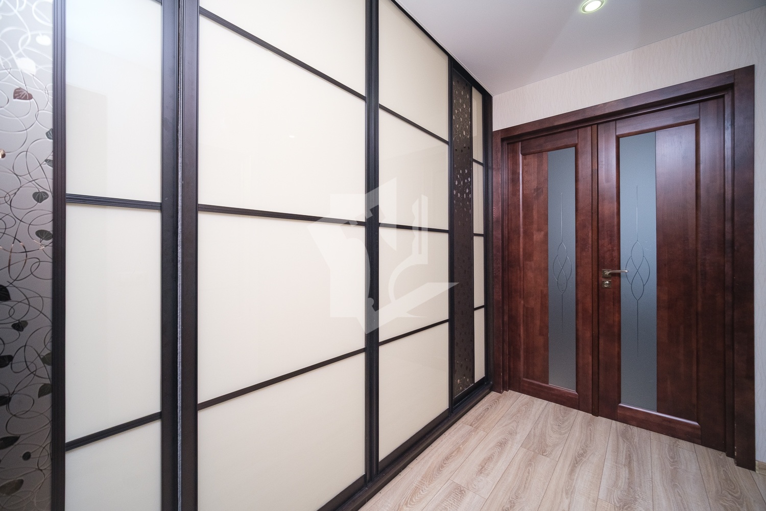 Ремонт в квартире выполнен в светлых тонах с контрастными акцентами межкомнатной и входной дверей, а также встроенных шкафов