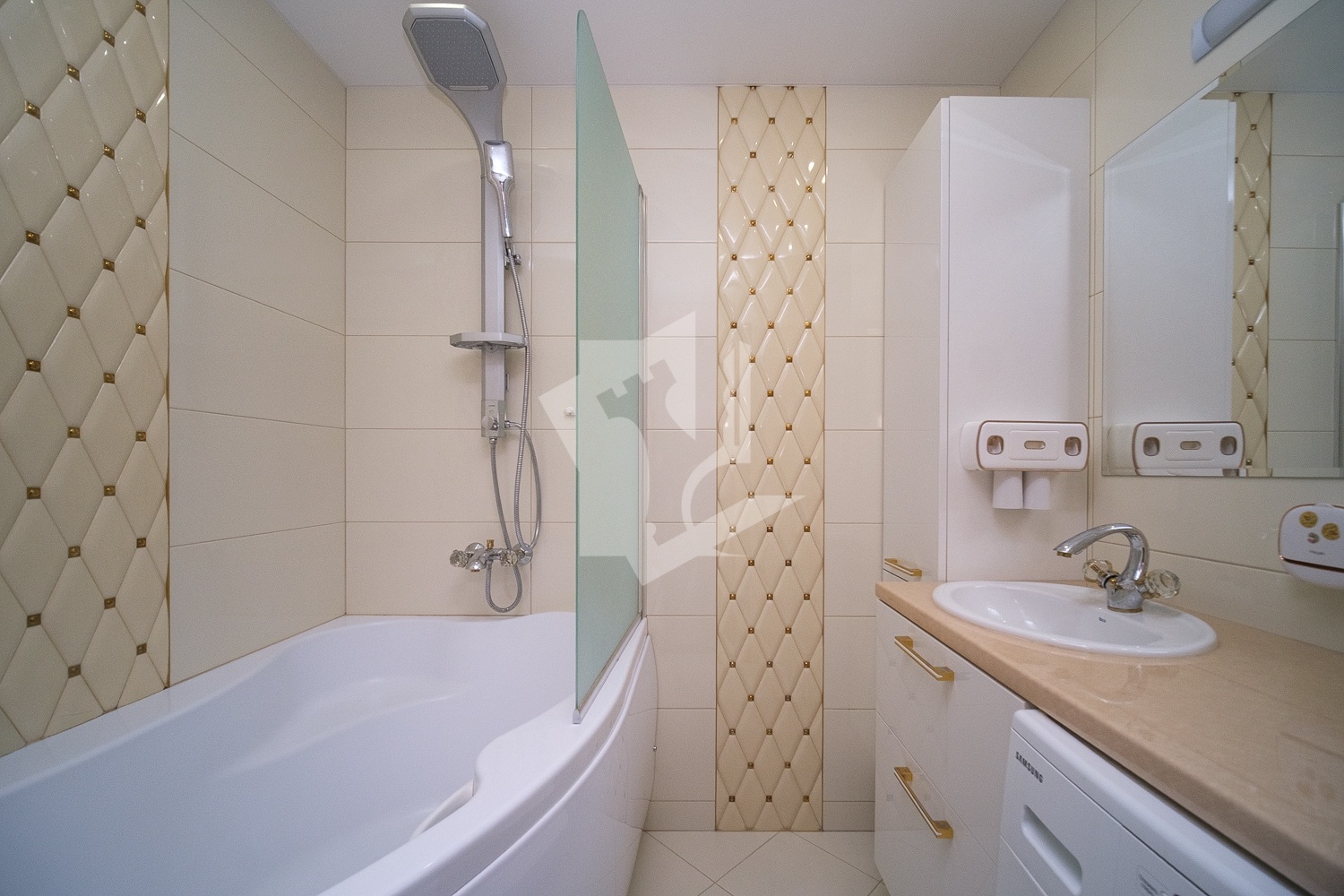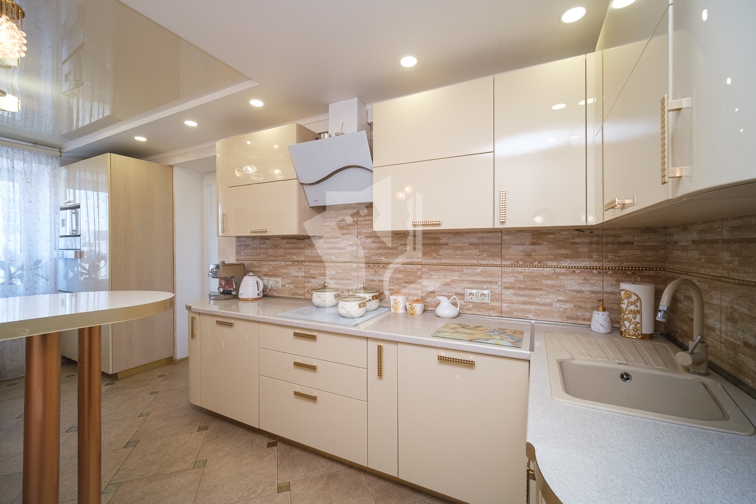 Изюминкой планировки можно считать расположение кухни: в центре квартиры между двумя изолированными комнатами. Хозяева не поскупились, выбирая бытовую технику: только известные, проверенные временем, бренды. Порадует размером полукруглая лоджия (3,5м2), просторная четырехметровая ванная комната