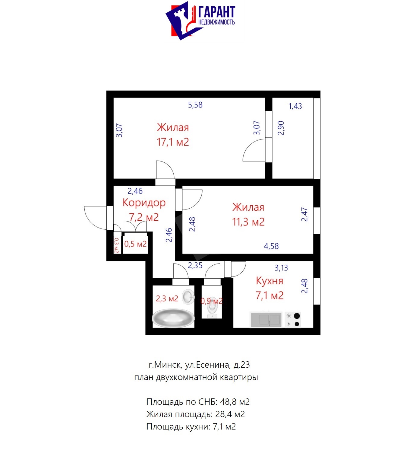 Рациональная планировка: площадь общая по СНБ 48.8 / жилая 28.4/ кухня 7.1 кв.м. Высота потолков - 2.52 м, удобный 4 этаж.