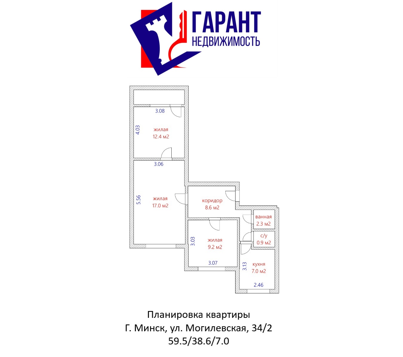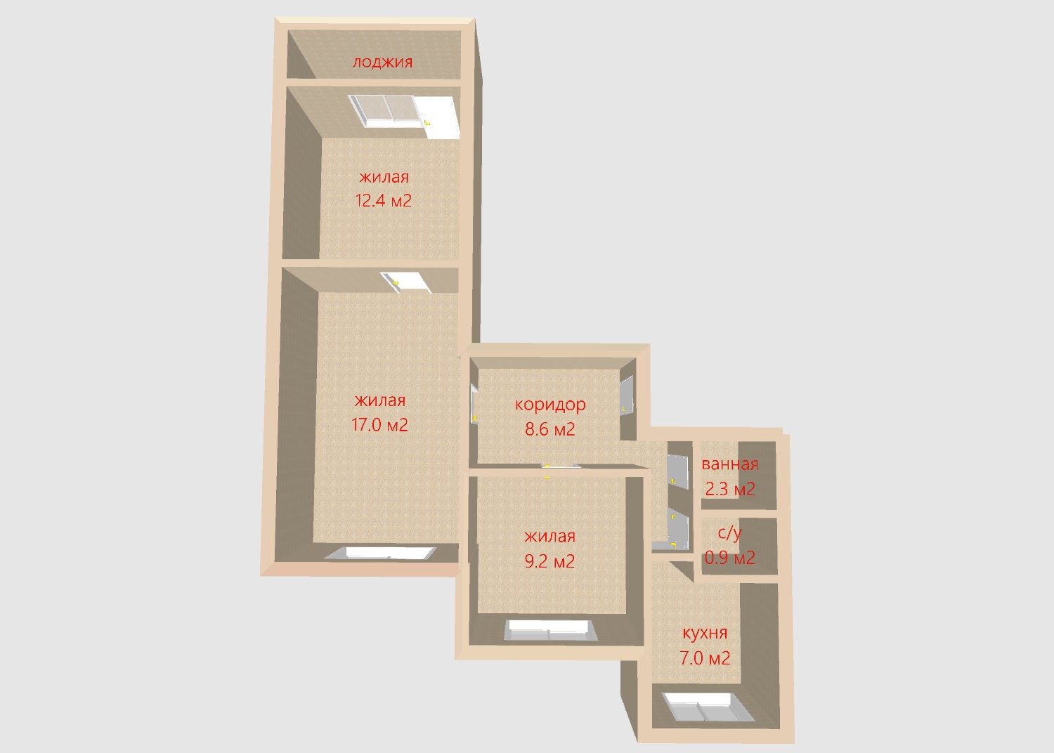 -Общая площадь 58.4 кв.м., а жилая – 38.6 кв.м.