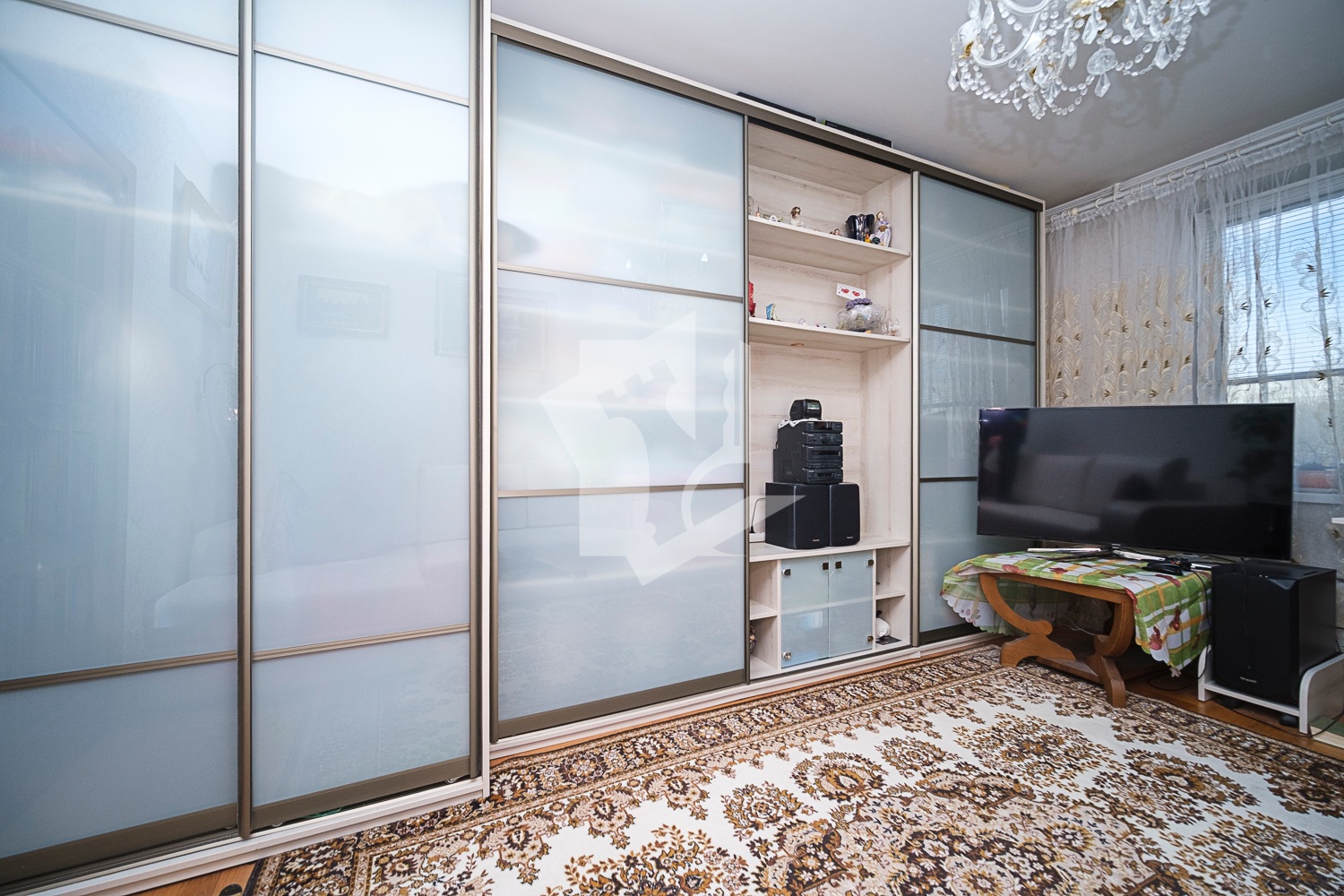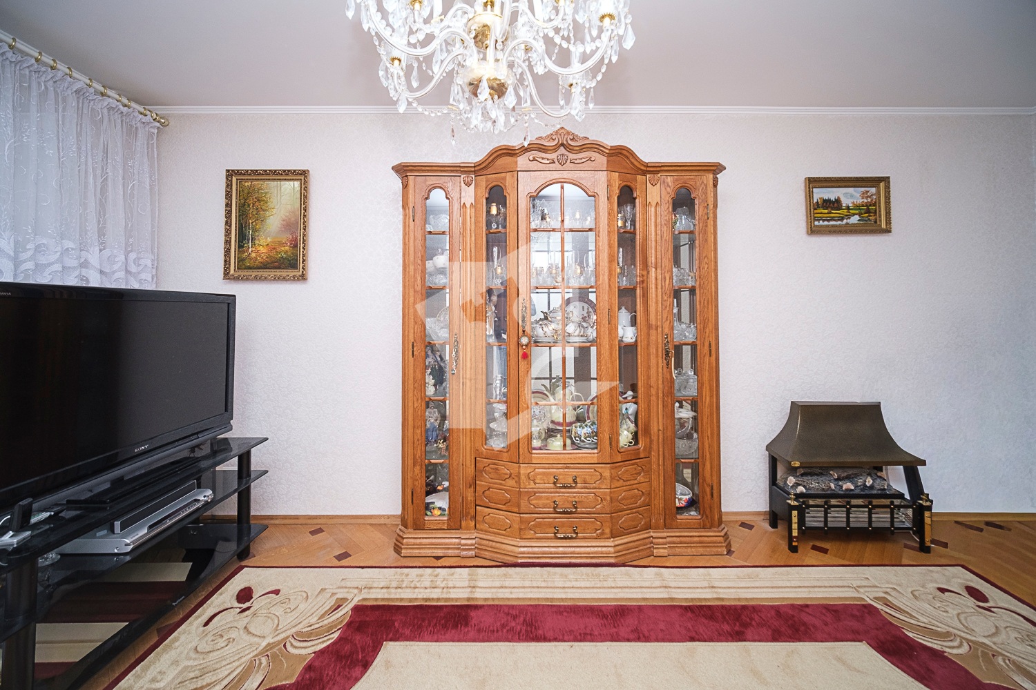 Окна ПВХ., напольное покрытие – паркет, на кухне плитка, межкомнатные двери- массив дерева, потолки окрашены.