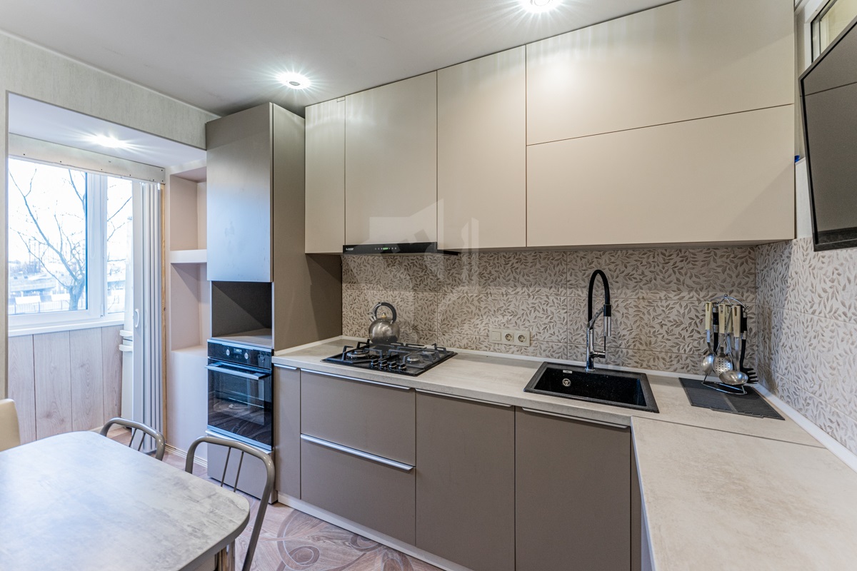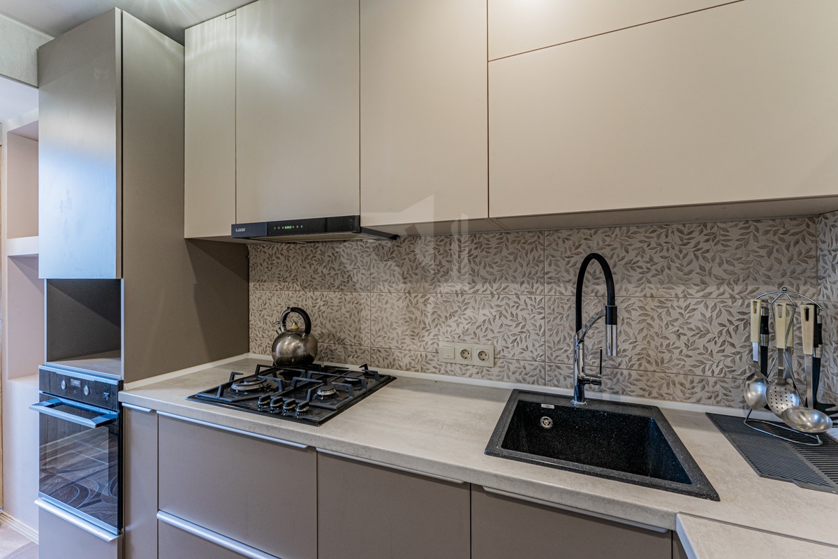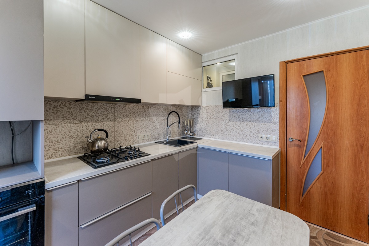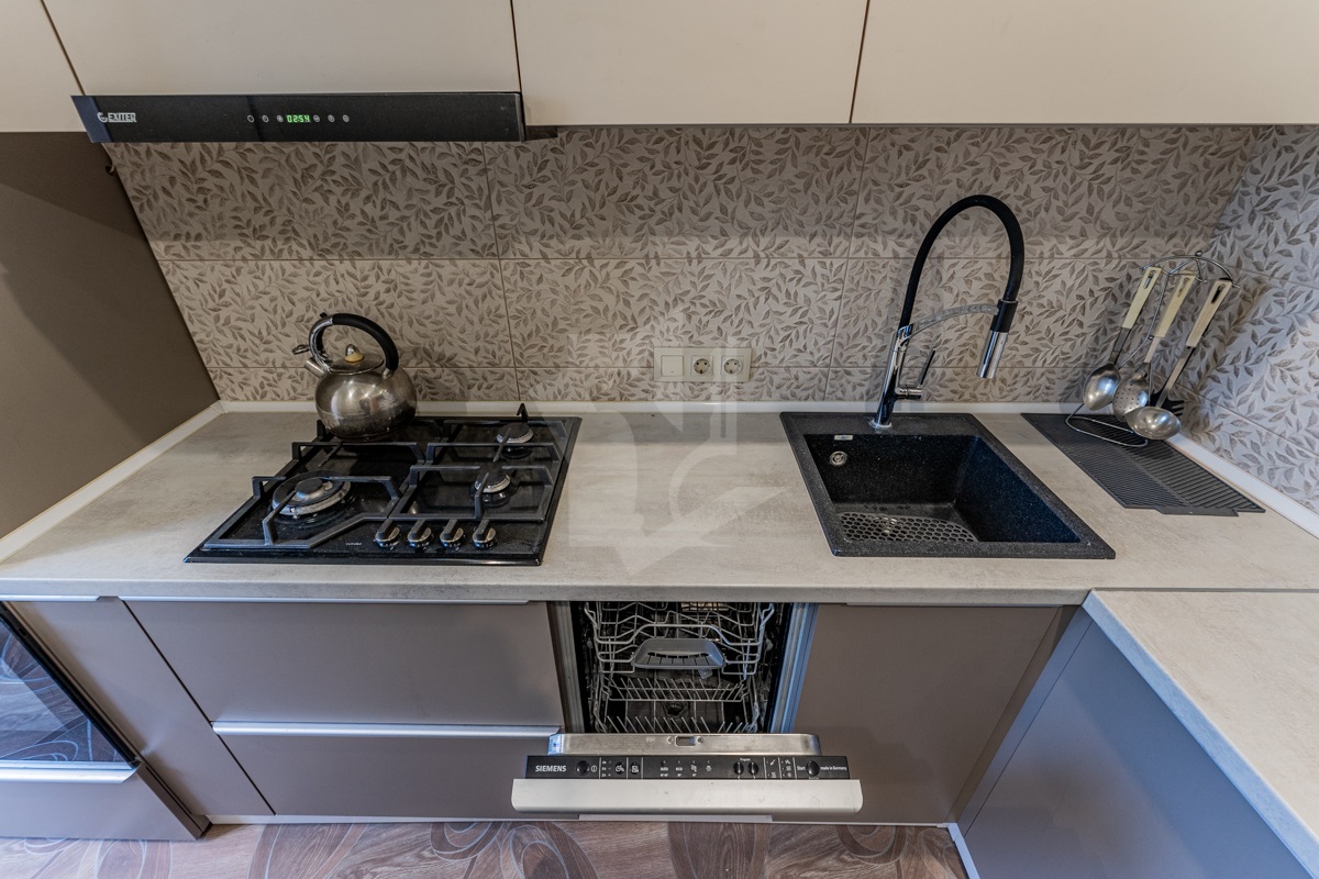 Кухня оборудована современной мебелью и встроенной техникой (духовой шкаф, варочная поверхность, вытяжка, посудомоечная машина)