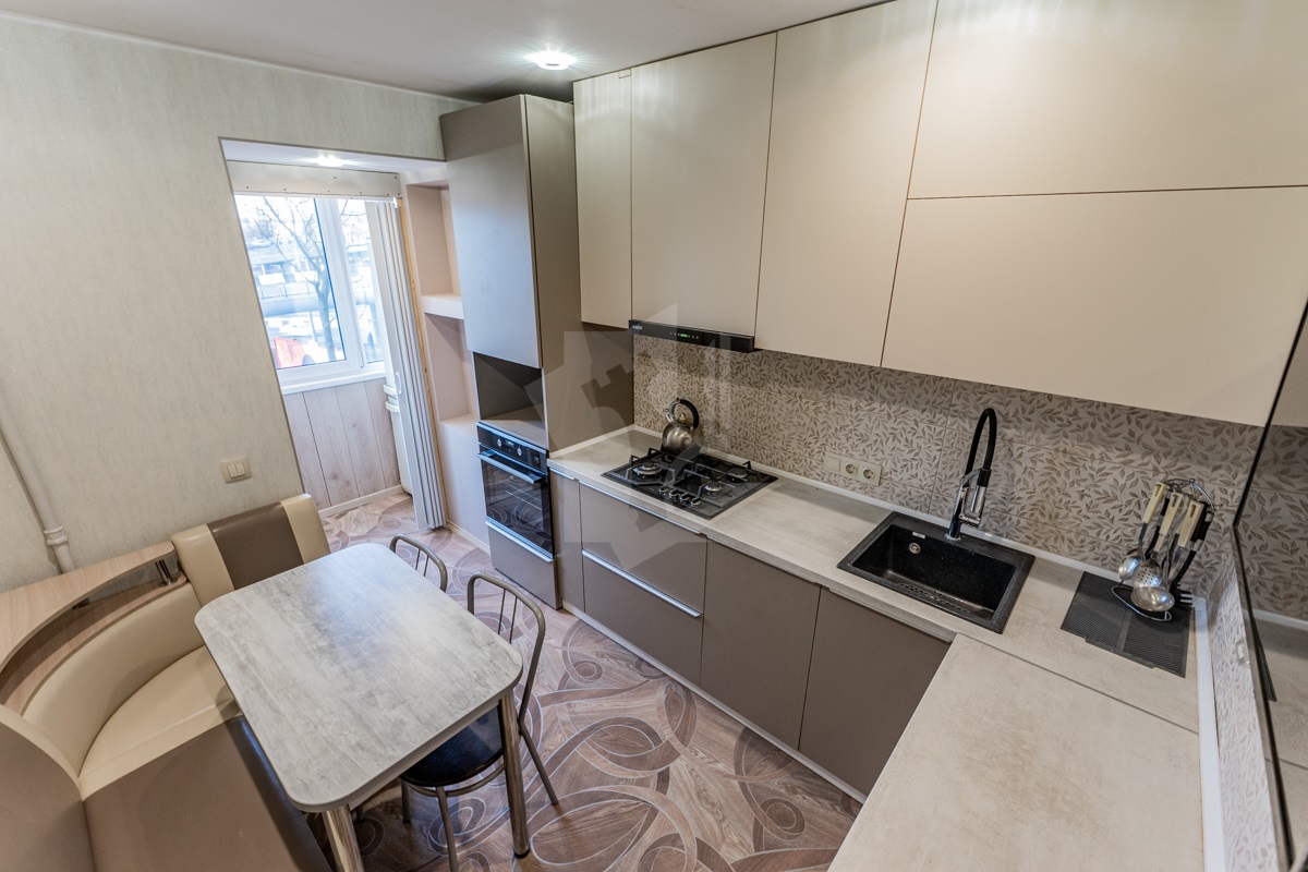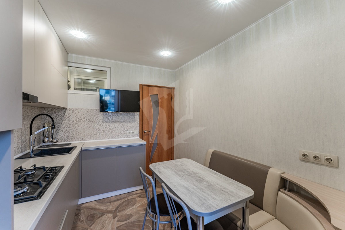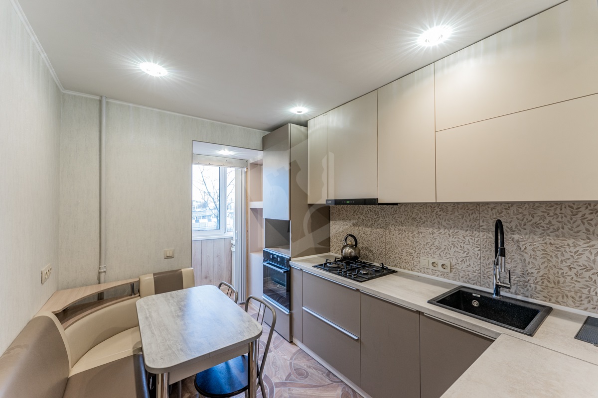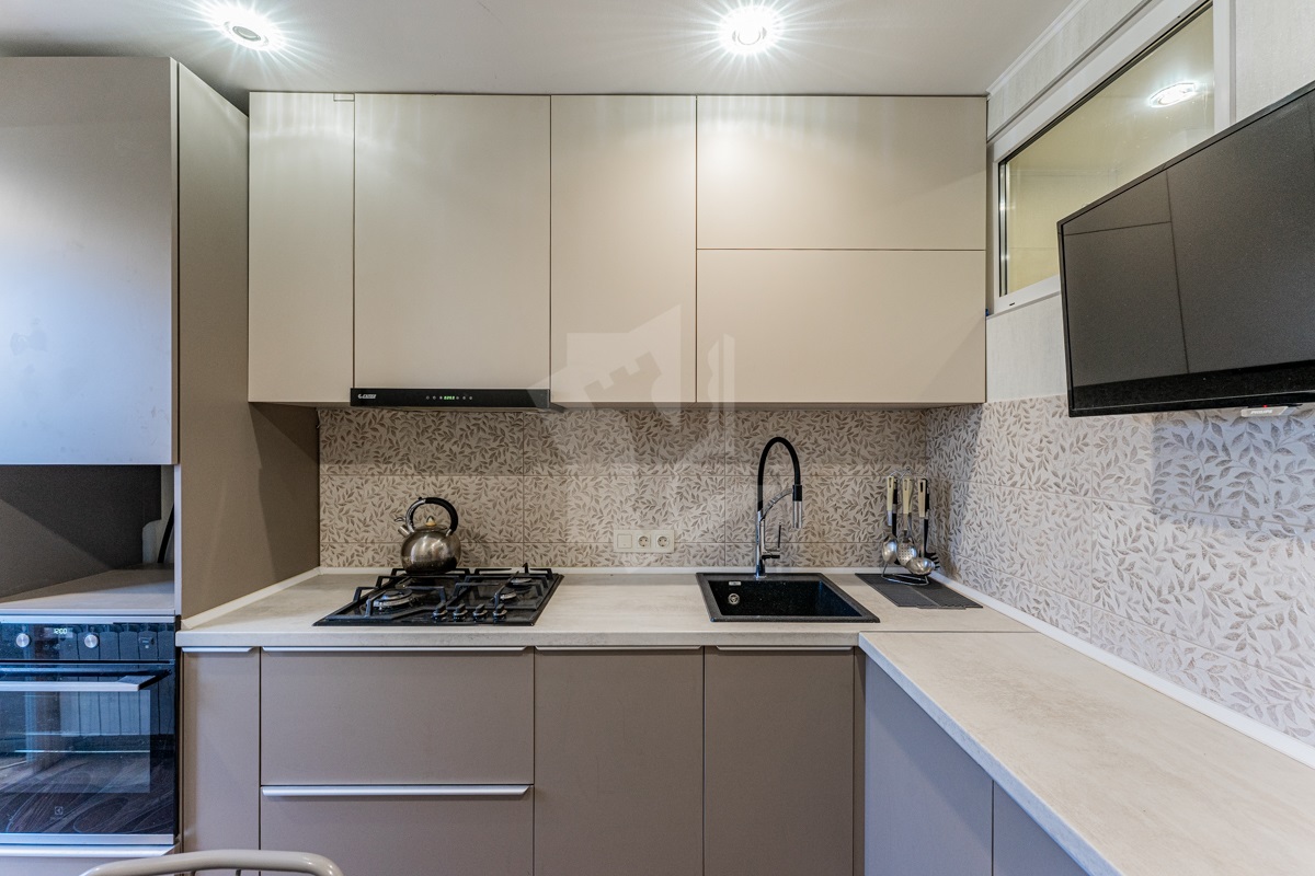 Кухня оборудована современной мебелью и встроенной техникой (духовой шкаф, варочная поверхность, вытяжка, посудомоечная машина)
