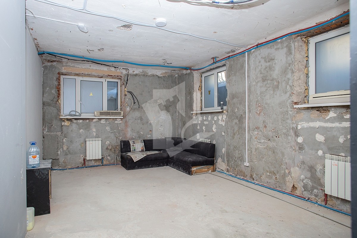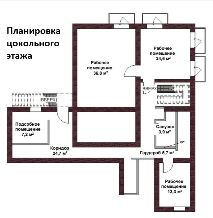 Помещение занимает первый и цокольный этажи жилого дома и имеет 2 собственных входа (на 1-й этаж, на цокольный), на цоколе расположены санузлы,помещения свободного назначения.