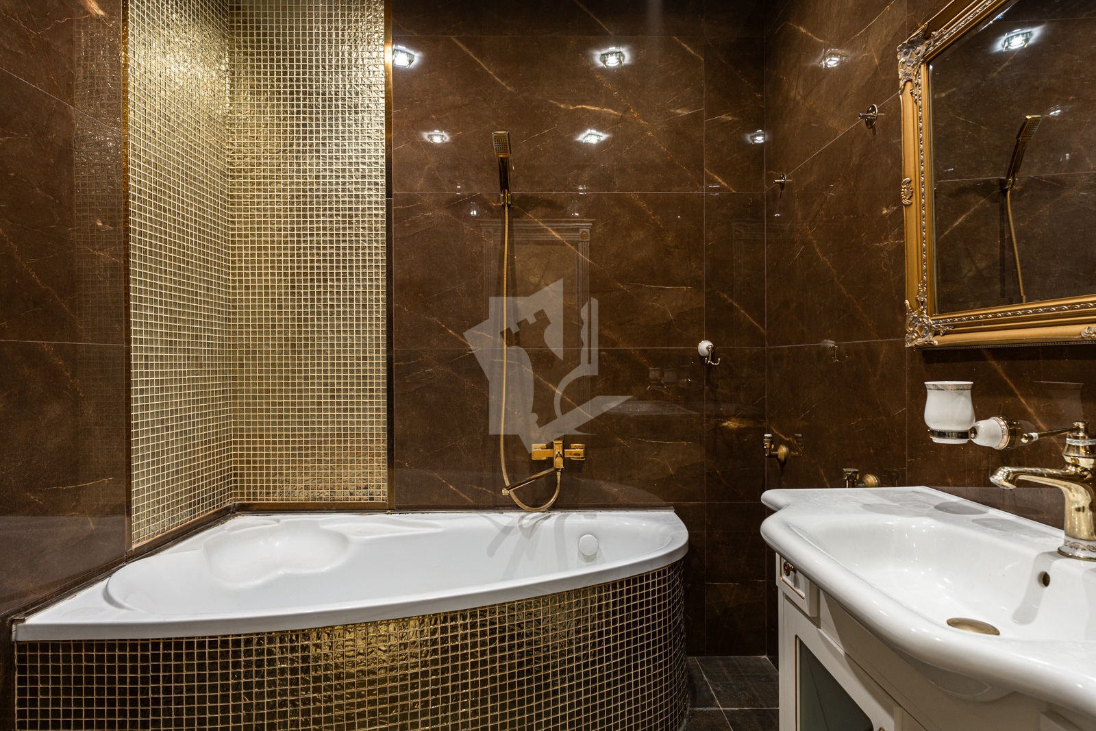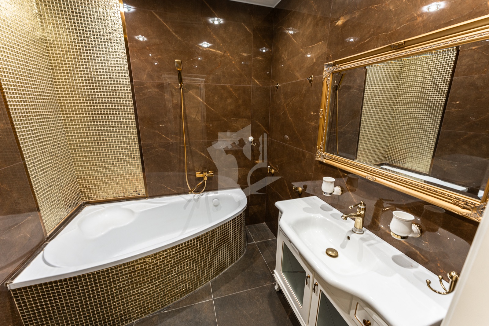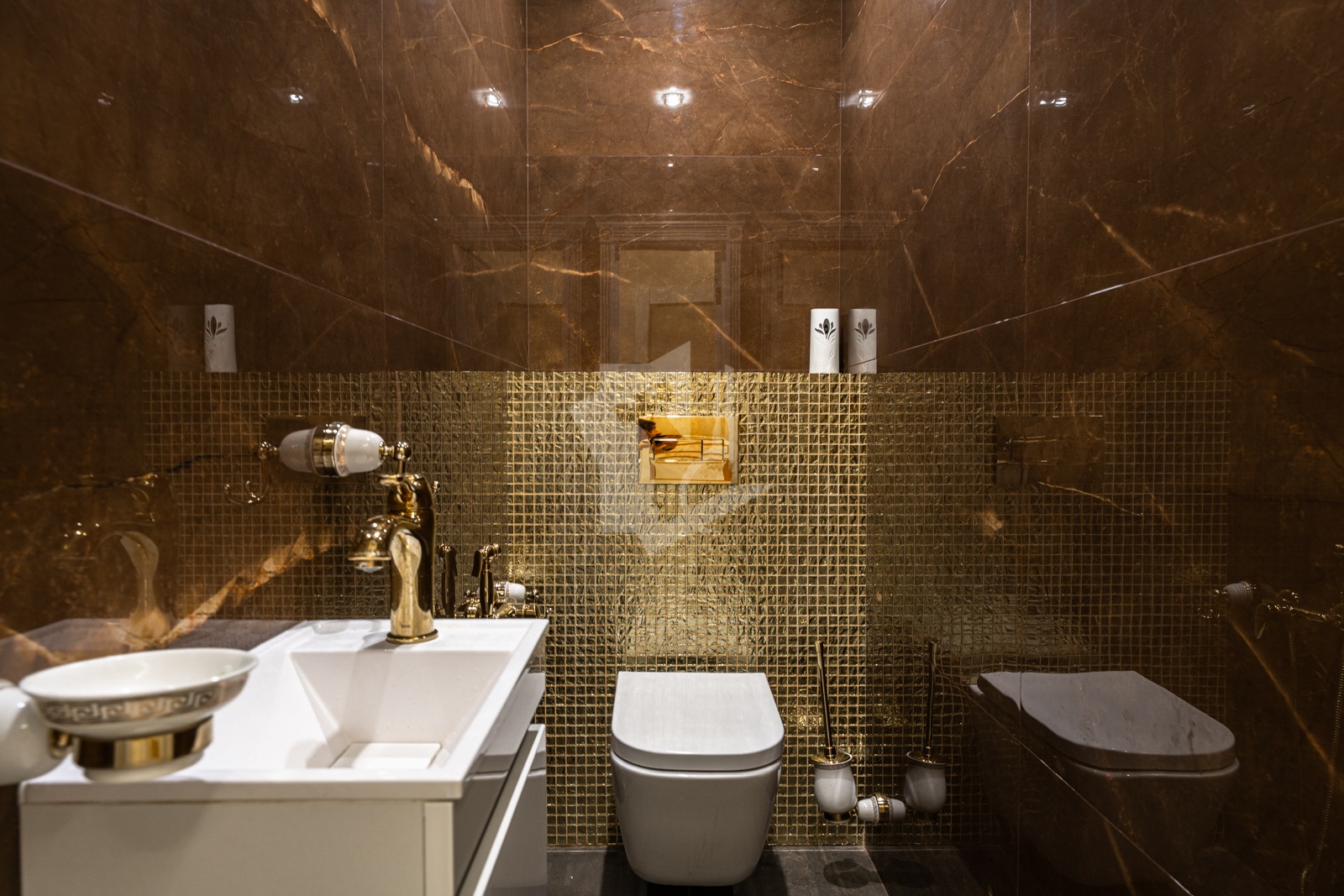 Сан. узлы облицованы также керамогранитом, коллекция Armani. Изюминку отделке придаёт мозаика.