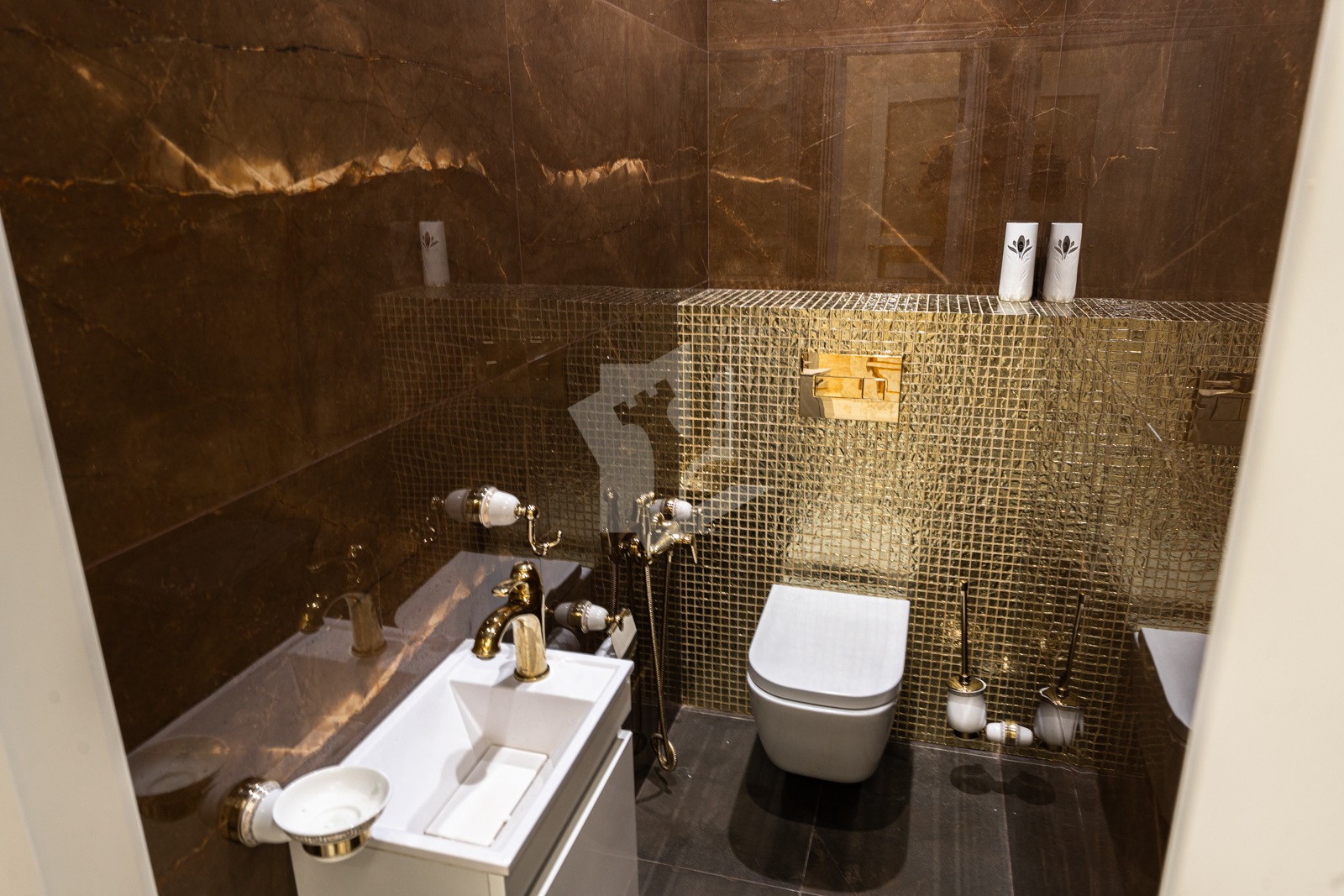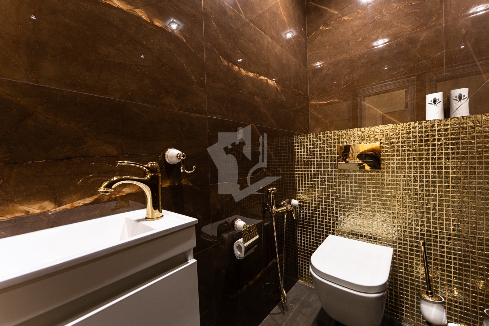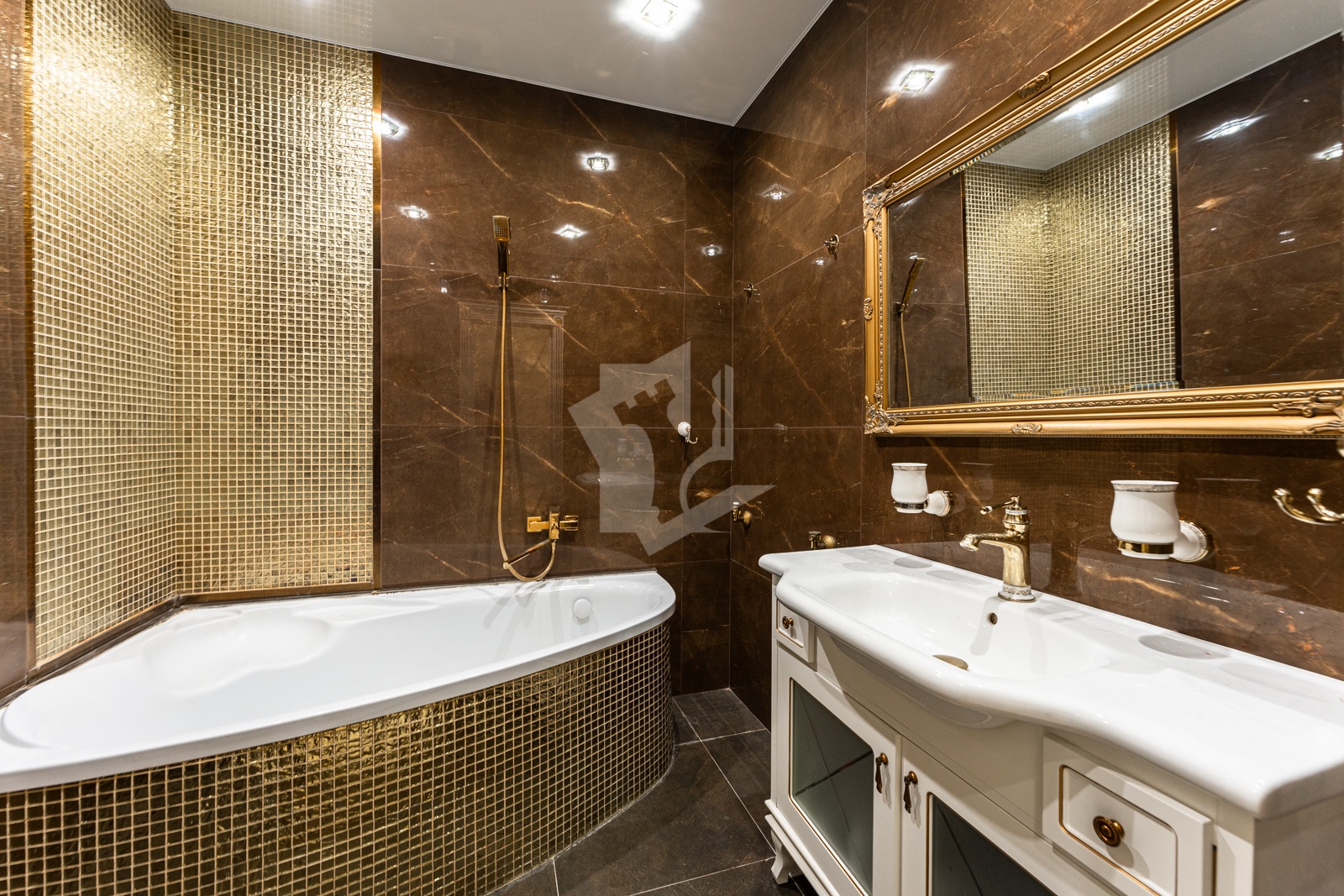 Сан. узлы облицованы также керамогранитом, коллекция Armani. Изюминку отделке придаёт мозаика.