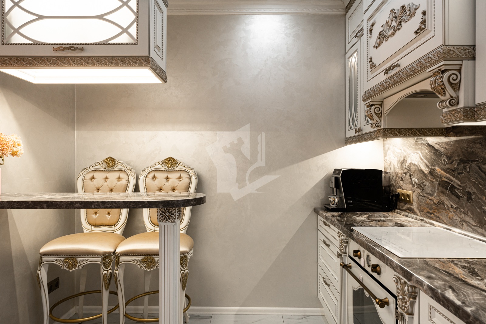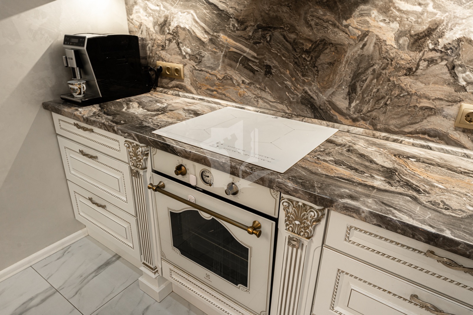 На полу – крупноформатный керамогранит. Роскошный мраморный рисунок придаёт ещё больше объёма пространству.
