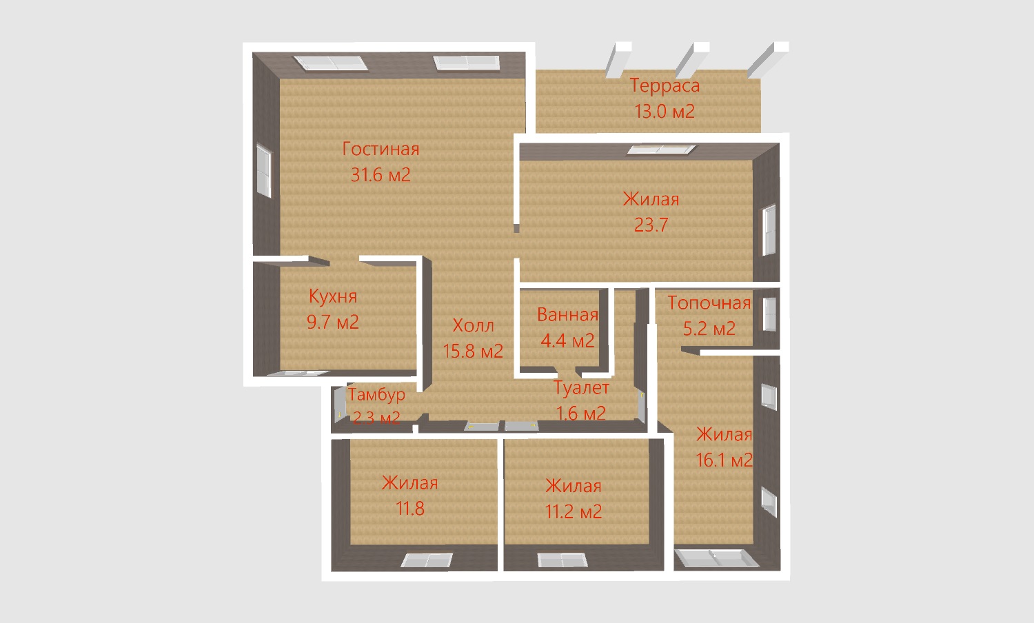 Мебель в доме подобрана в одном стиле. Обивка выполнена из долговечного и износостойкого материала.