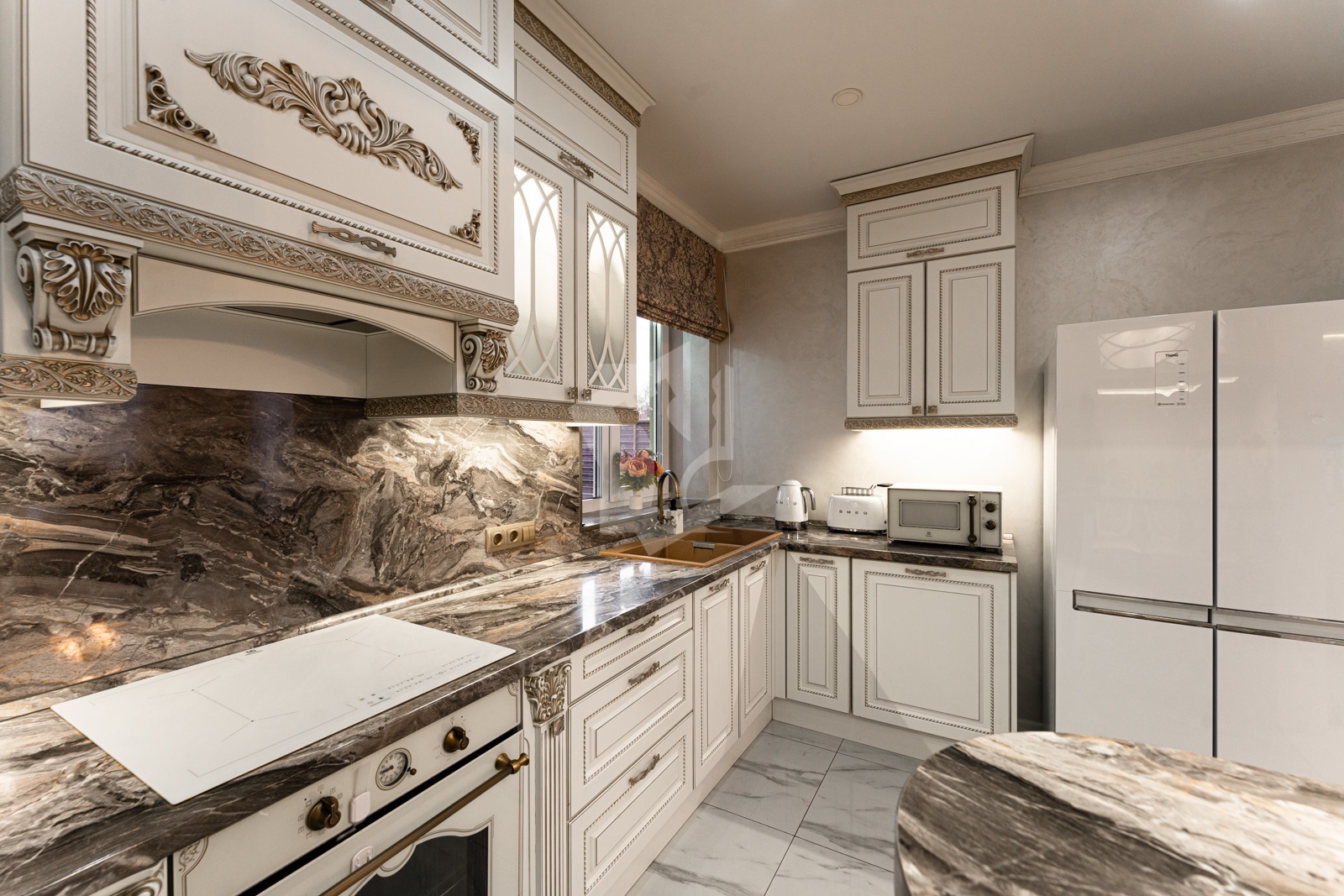 Уютная кухня оборудована всей необходимой мебелью, техникой и освещением.