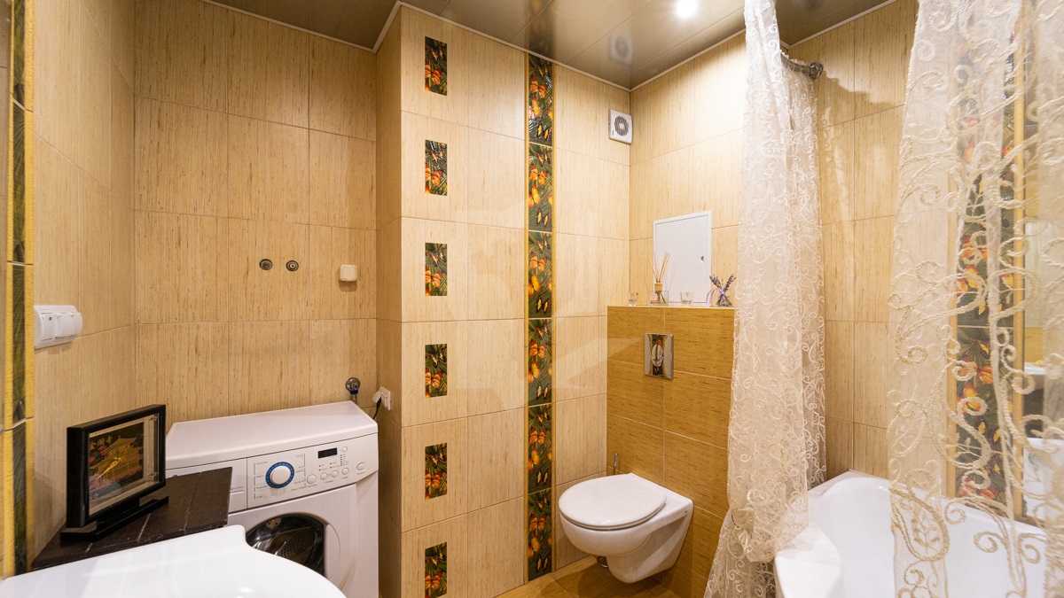 ⁃ пол: ламинат, плитка, потолки гипсокартон со встроенными светильниками.