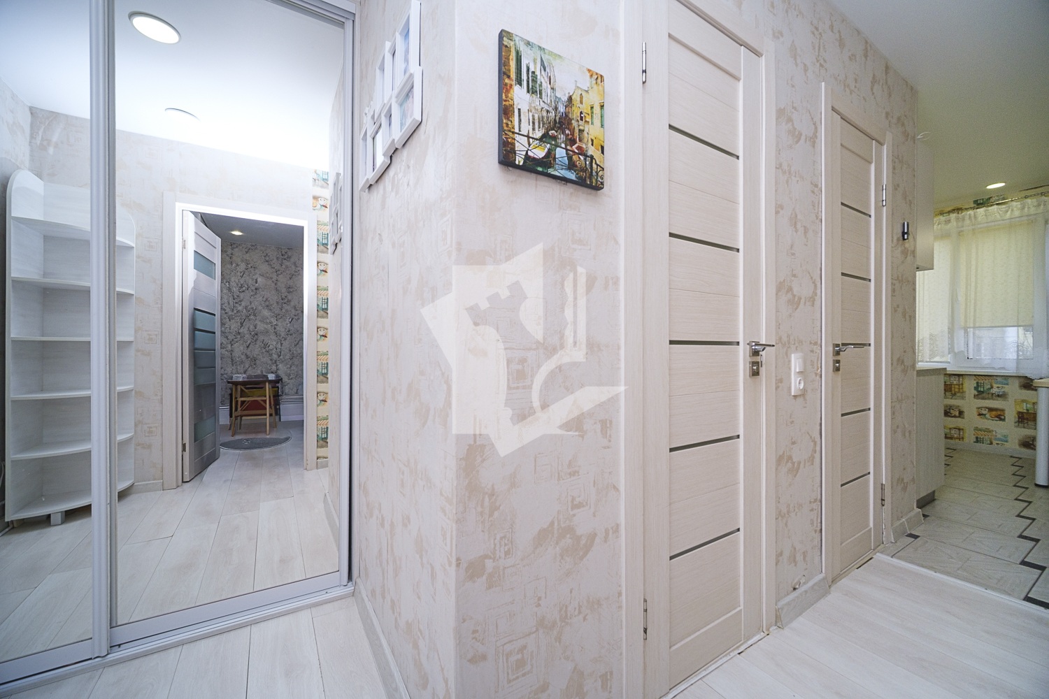 Квартира расположена на 6 этаже 9-этажного дома. В квартире выполнен хороший ремонт: встроенная мебель, натяжные потолки, окна ПВХ, балкон благоустроен и застеклён, в санузлах выполнена отделка плиткой, полы ламинат, в кухне на полу плитка, входная металлическая дверь.