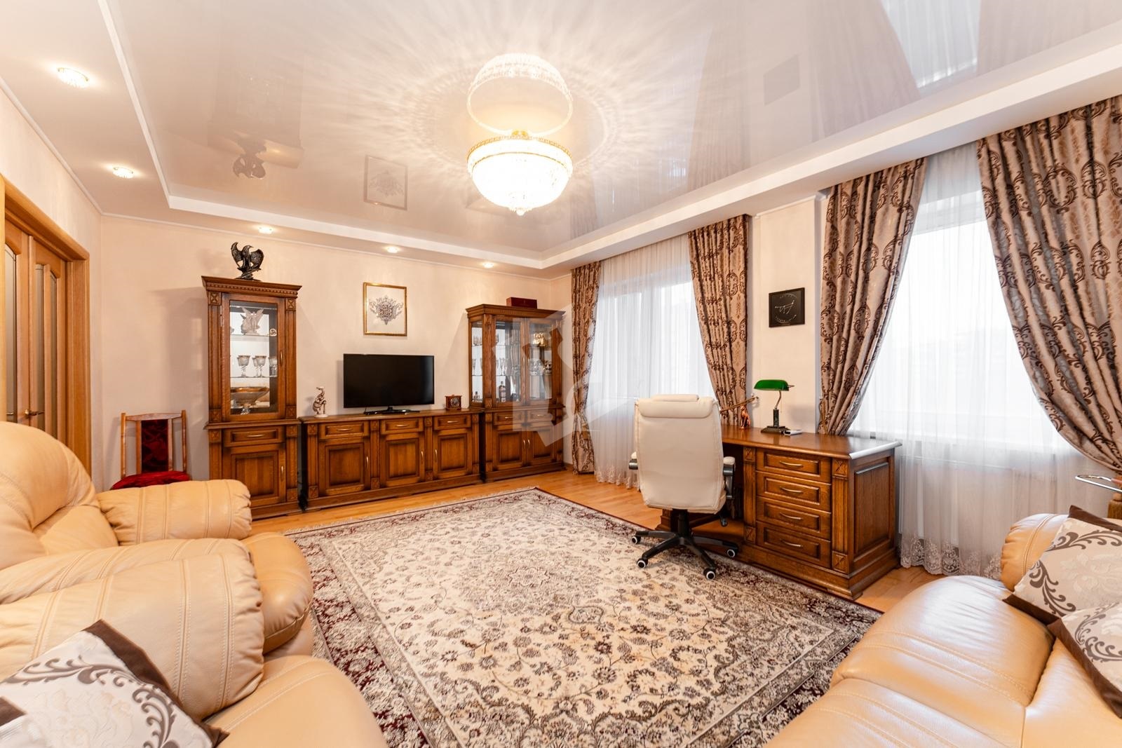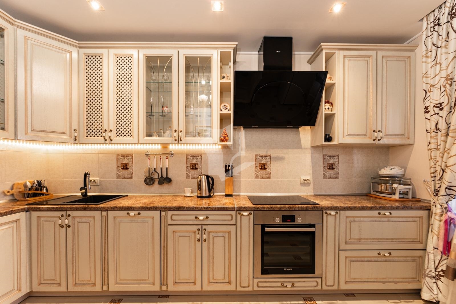 Есть все необходимое для комфортного проживания. Техника (BOSCH), португальская мебель из натуральных материалов дерева, два кондиционера, посудомоечная машина, подогрев пола в зоне (кухни, коридора, два сан.узла, тамбур площадью 4.1 кв.метров). Регулировки освещения, а так же био камин. Две лоджии обшиты натуральной вагонкой.