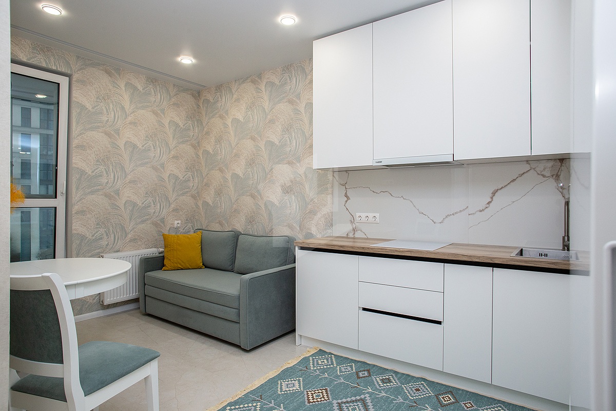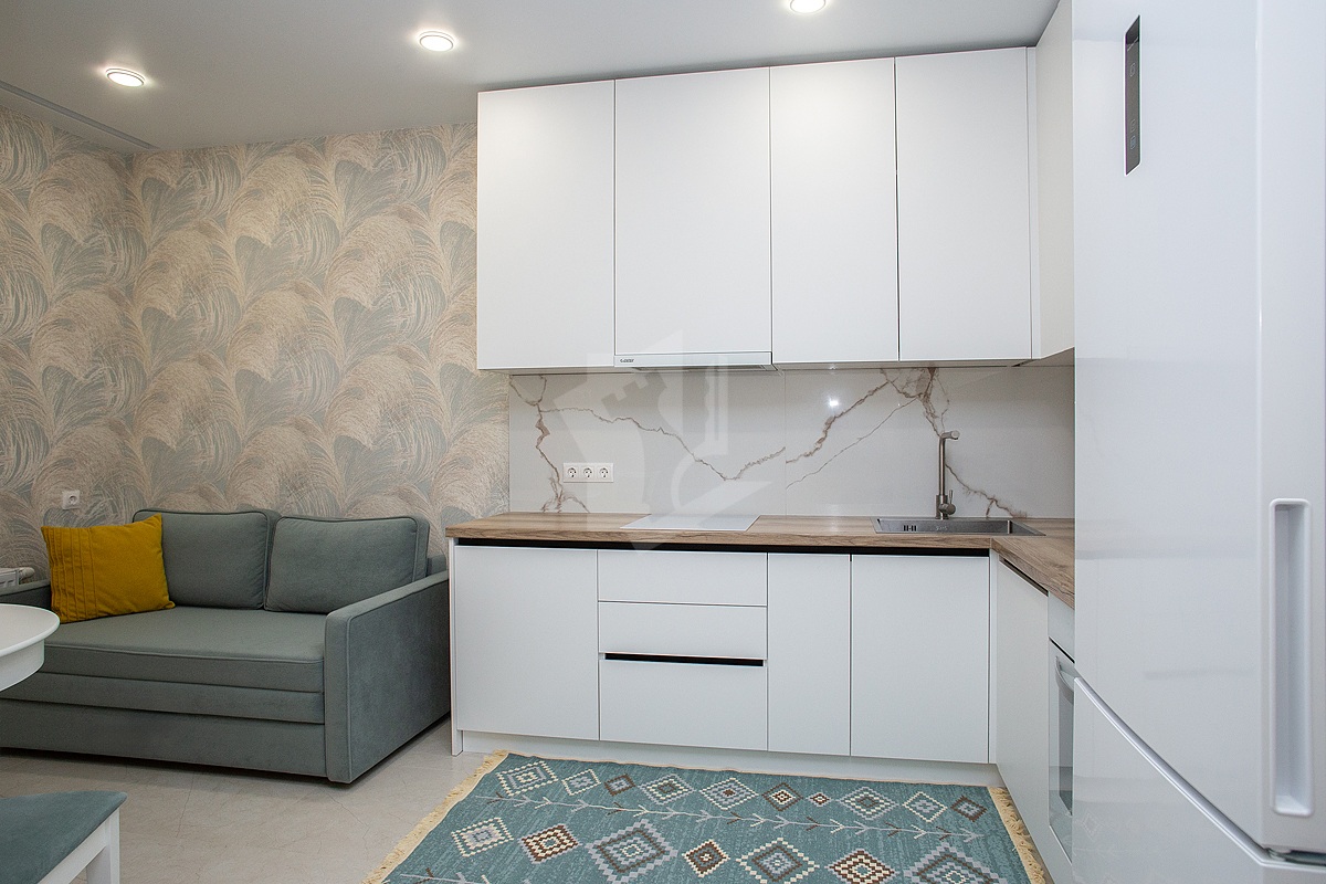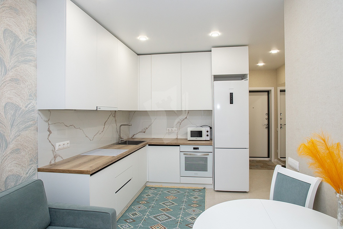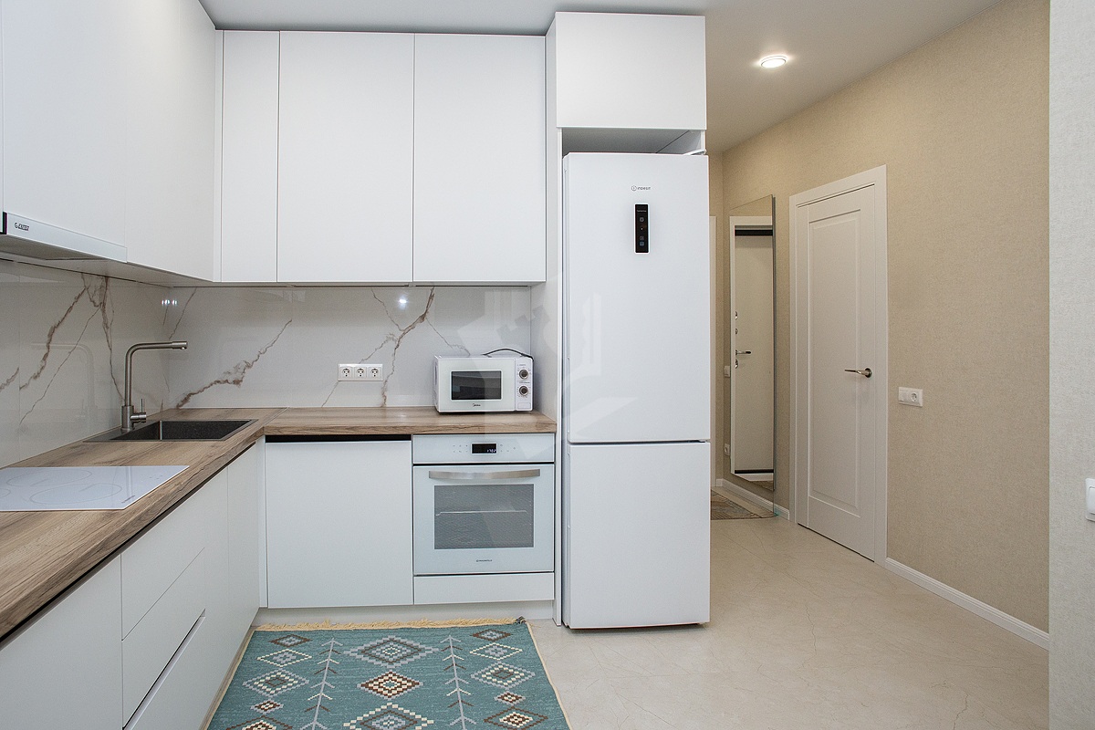 - Современная кухня оснащена всеми необходимыми приборами: духовкой, варочной панелью с вытяжкой, микроволновой печью и встроенным холодильником с морозильной камерой.