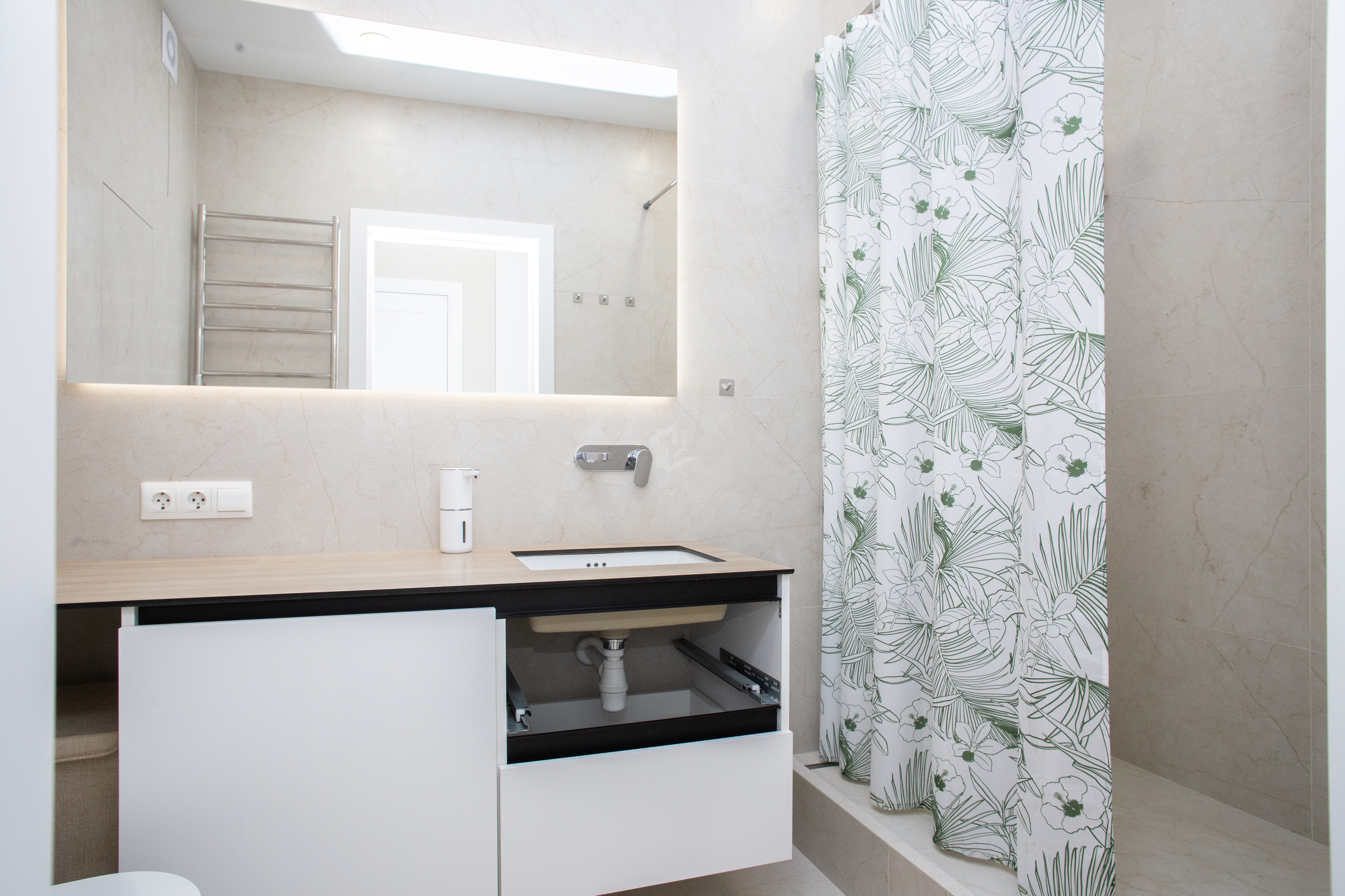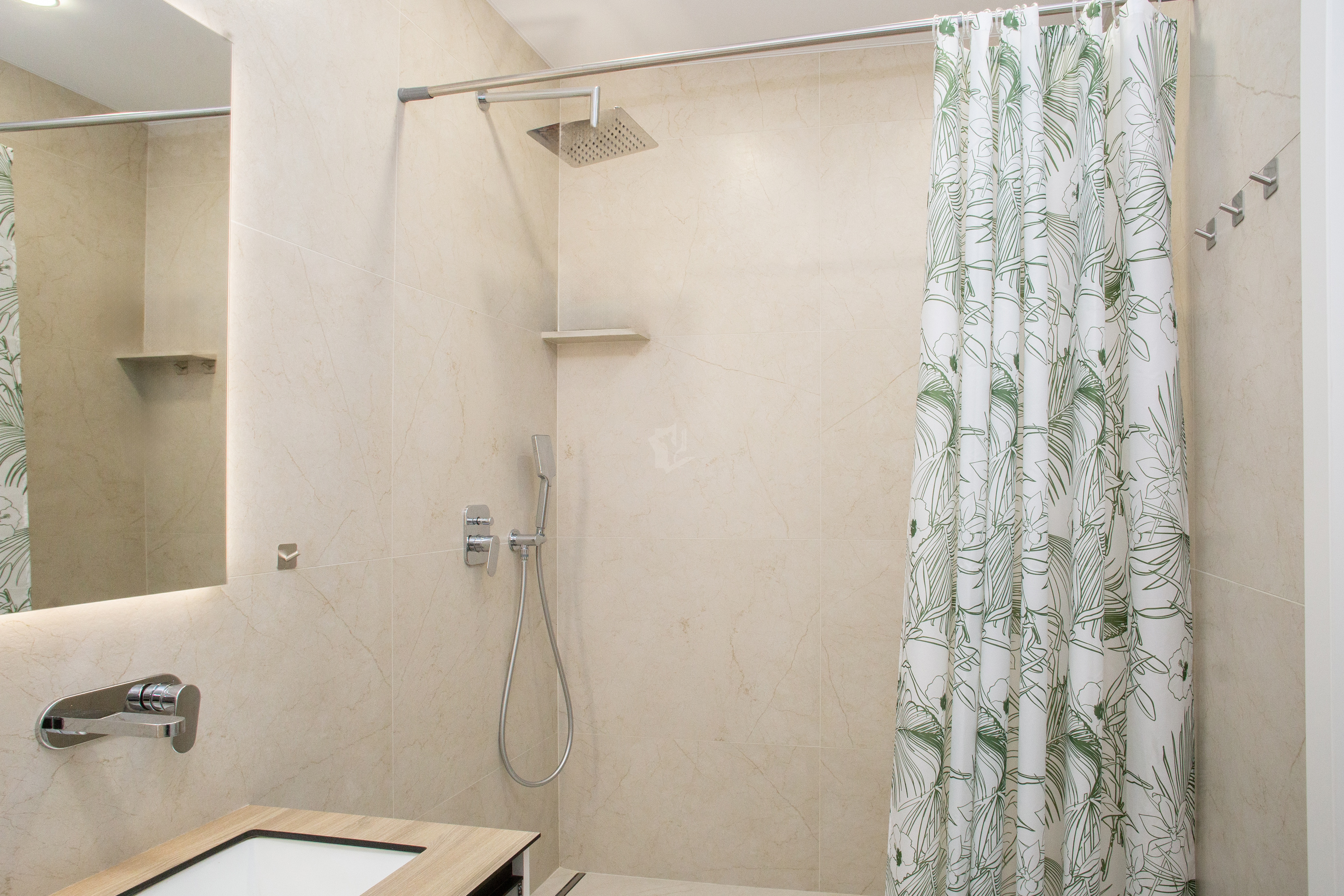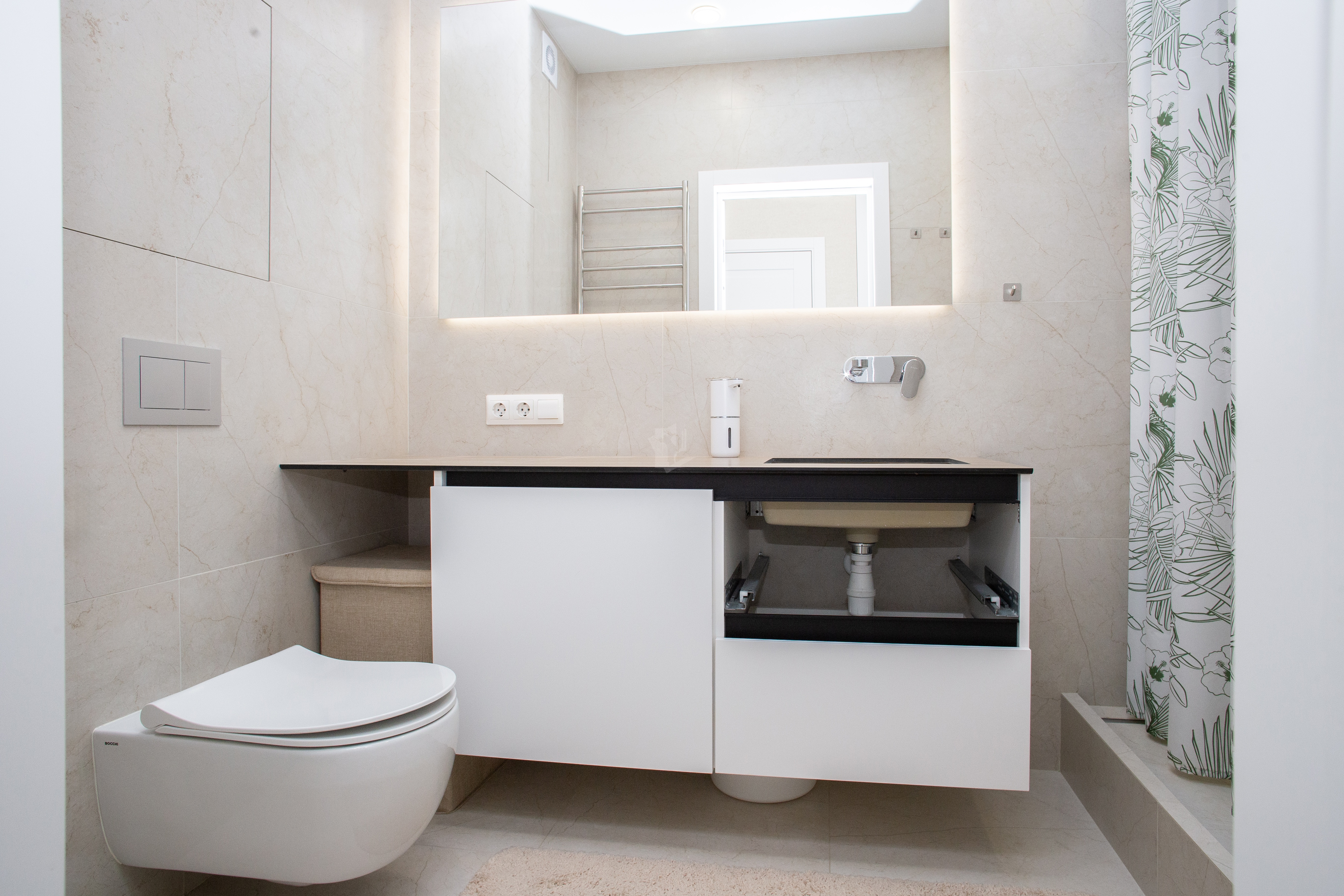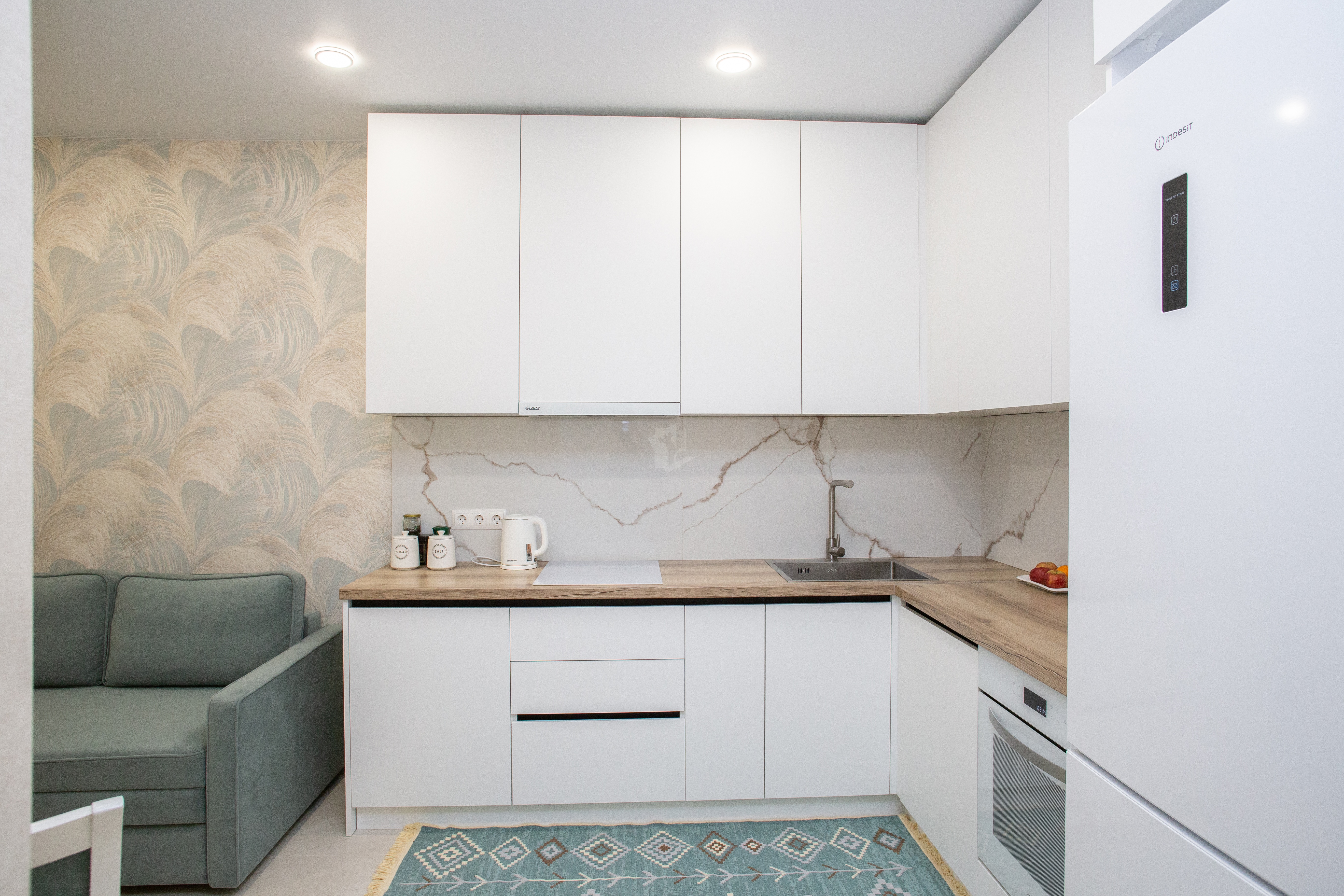 - Современная кухня оснащена всеми необходимыми приборами: духовкой, варочной панелью с вытяжкой, микроволновой печью и встроенным холодильником с морозильной камерой.