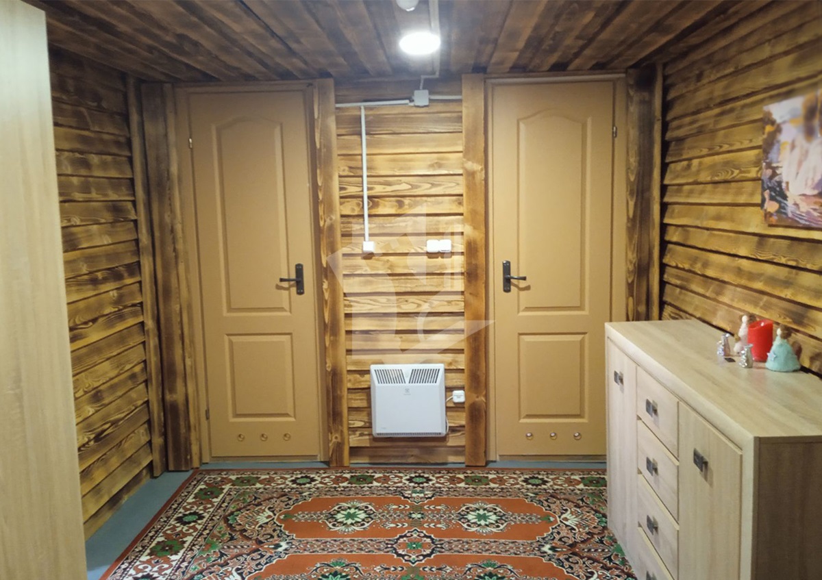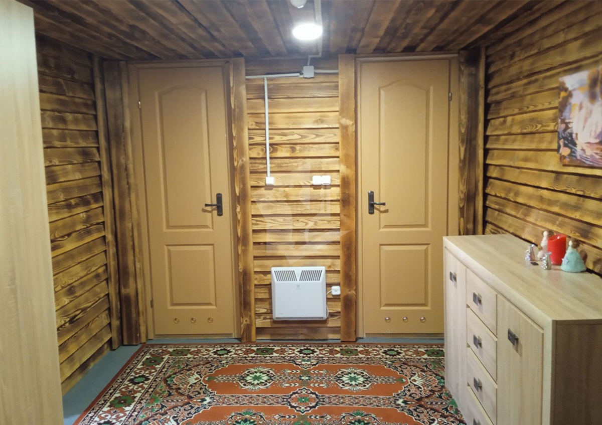 - стены бревенчатые, обложенны кирпичем и задекарированны досками в стиле лофт;