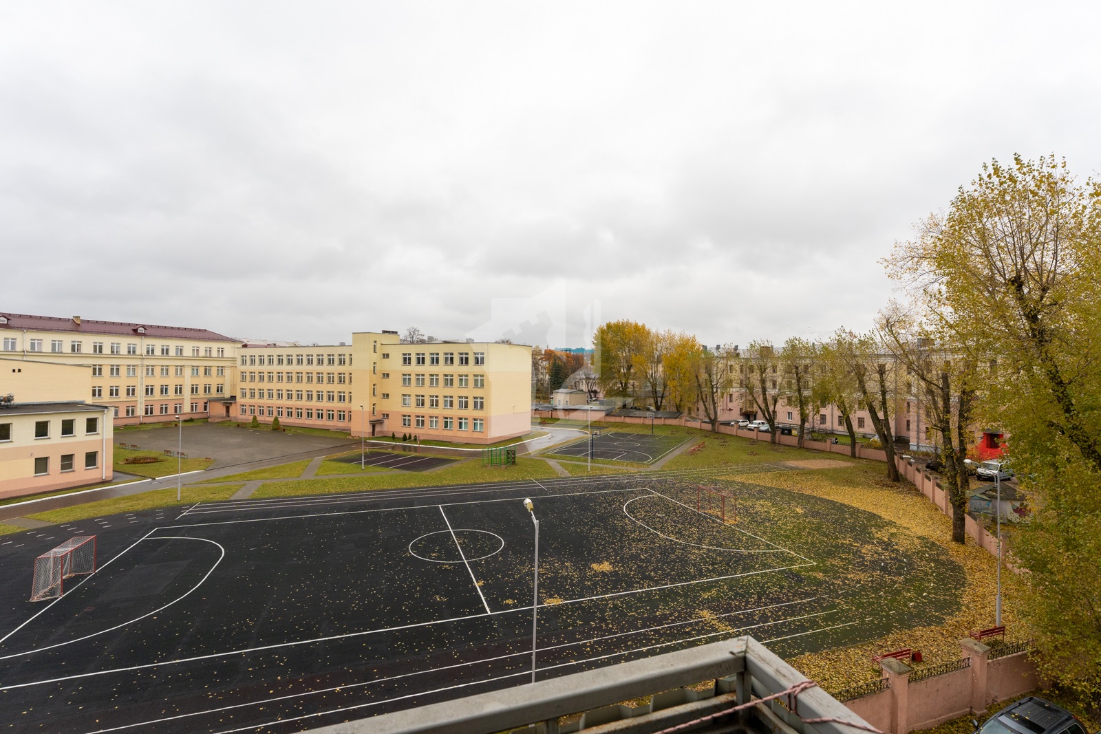 С одной стороны вид на школу, а с другой - на зеленую зону и вид на Церковь Рождества Иоанна.