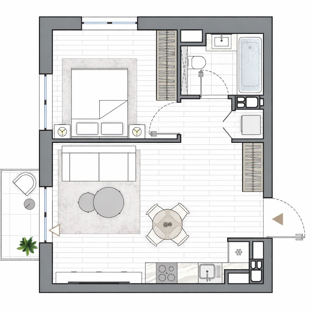 Квартира правильной формы с одной из самых востребованных и функциональных планировок — евродвушка на три окна, наполненная светом и ощущением простора.