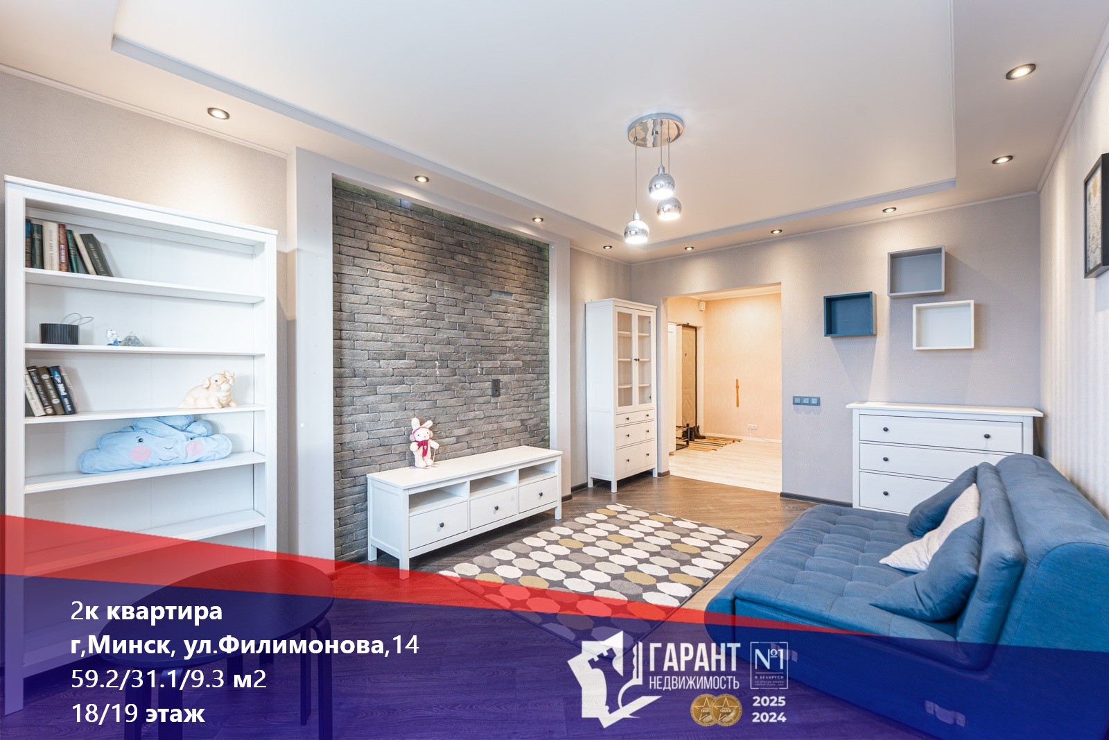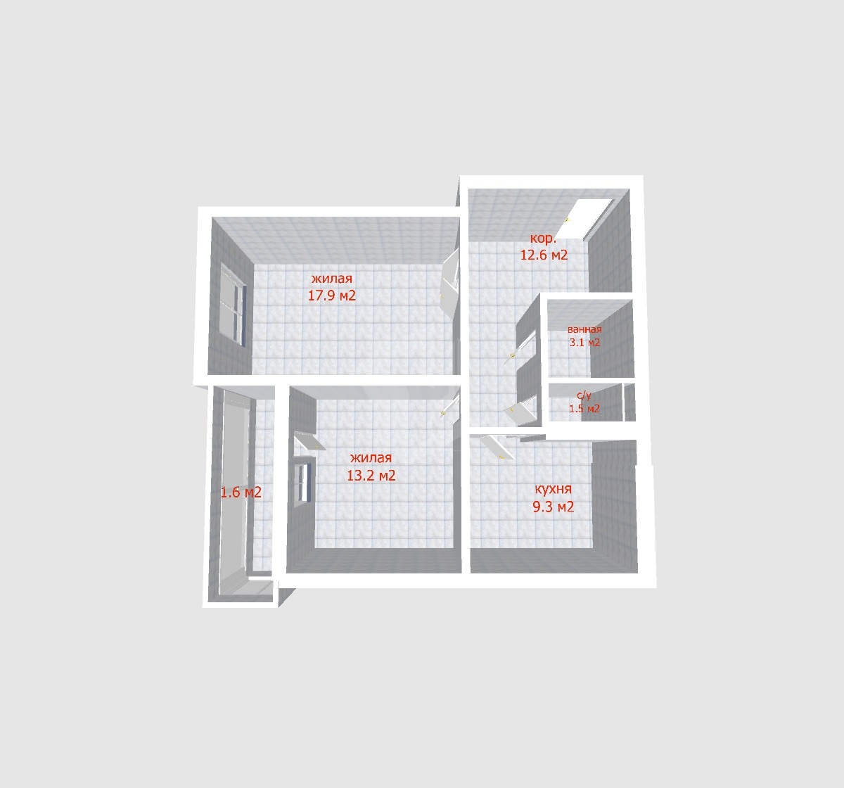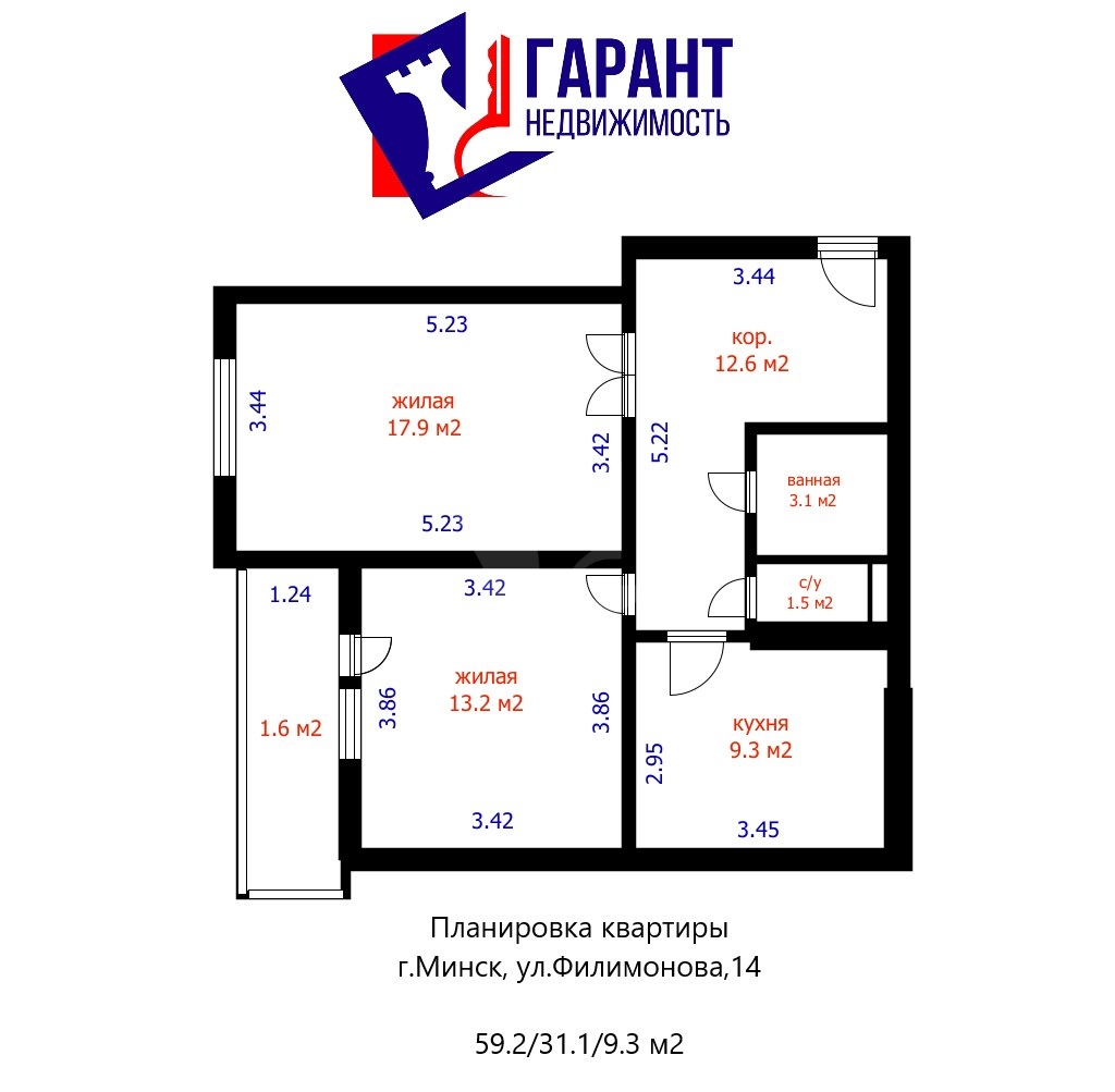 • Продуманная планировка: общая площадь 59,2 м², жилая 31,1 м², кухня 9,3 м². Удобный прямоугольный коридор позволяет рационально использовать каждый уголок.