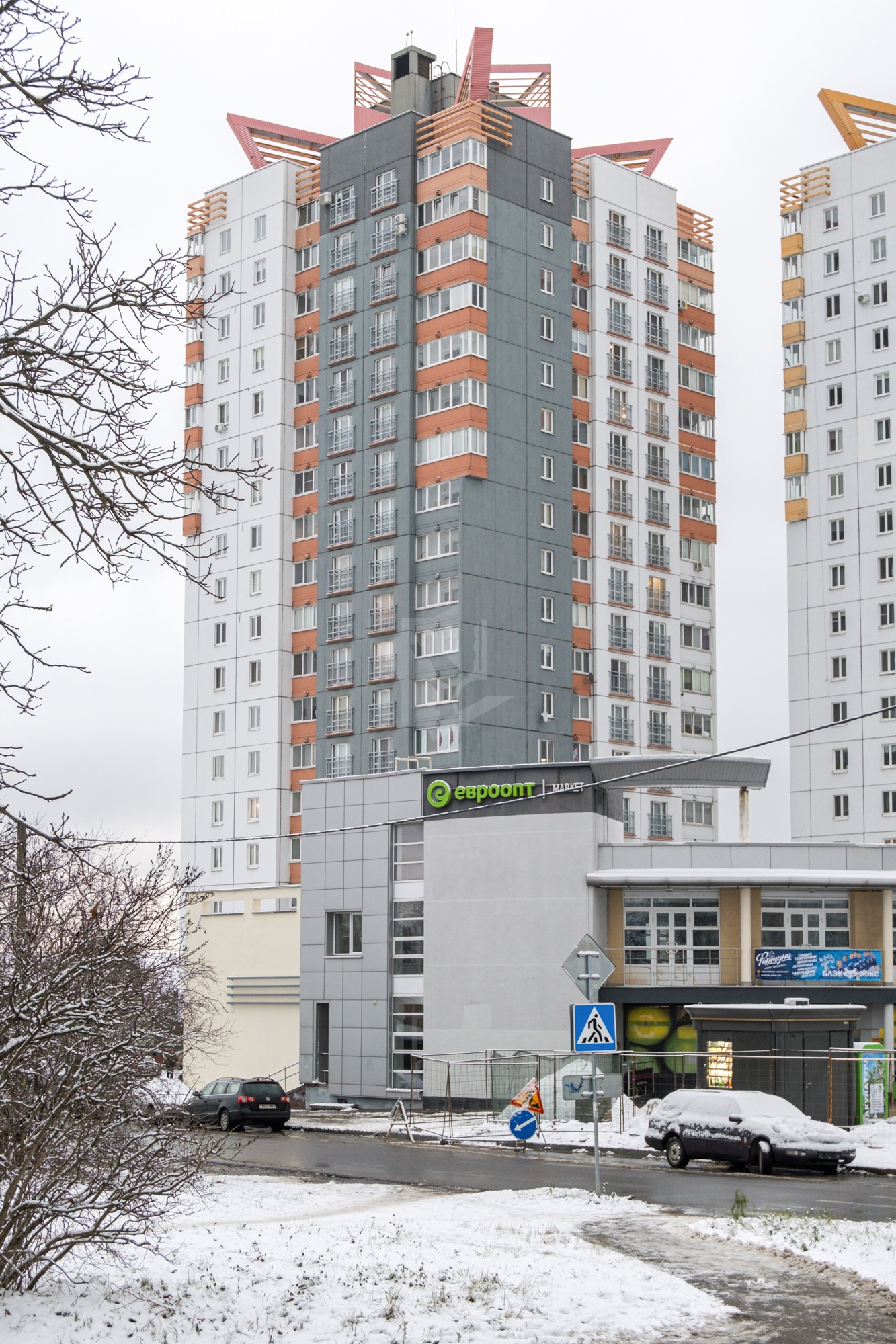 Есть все необходимое для комфортной жизни: супермаркеты «Евроопт Super», банки, аптеки.