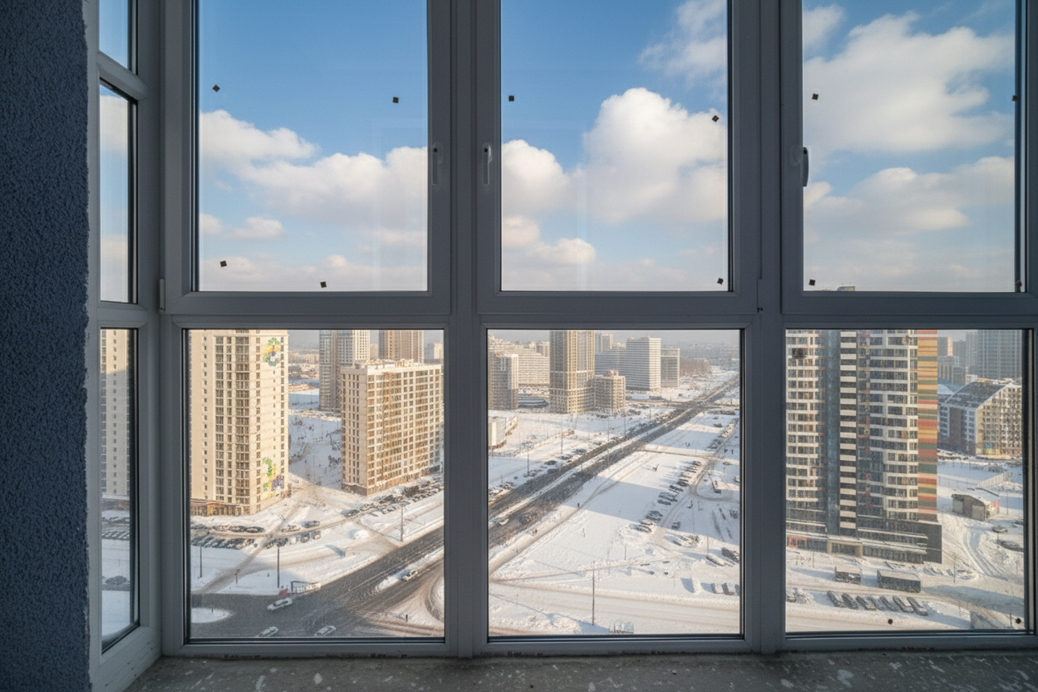Вид из окна: Большие окна обеспечивают прекрасное естественное освещение и панорамный вид на город.