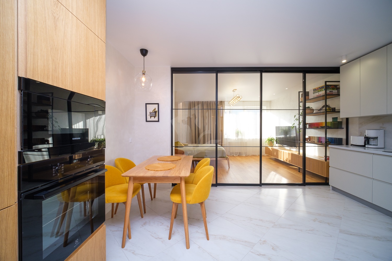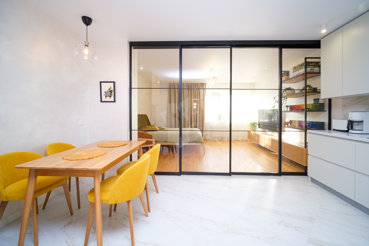 Просторная гостиная объединена с кухней, что создает ощущение простора и свободы, но при этом оборудована стеклянной раздвижной перегородкой, которая не утяжеляет пространство, но при этом даёт возможность для уединения.