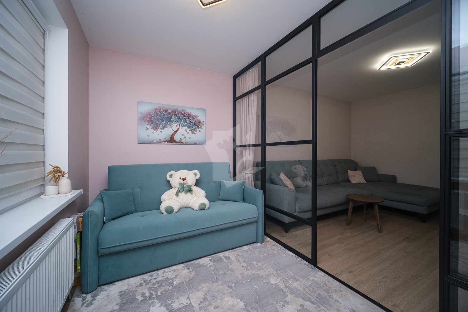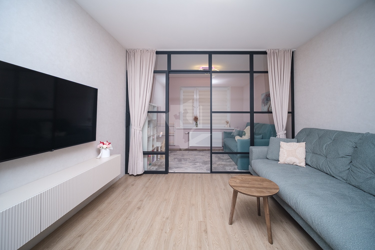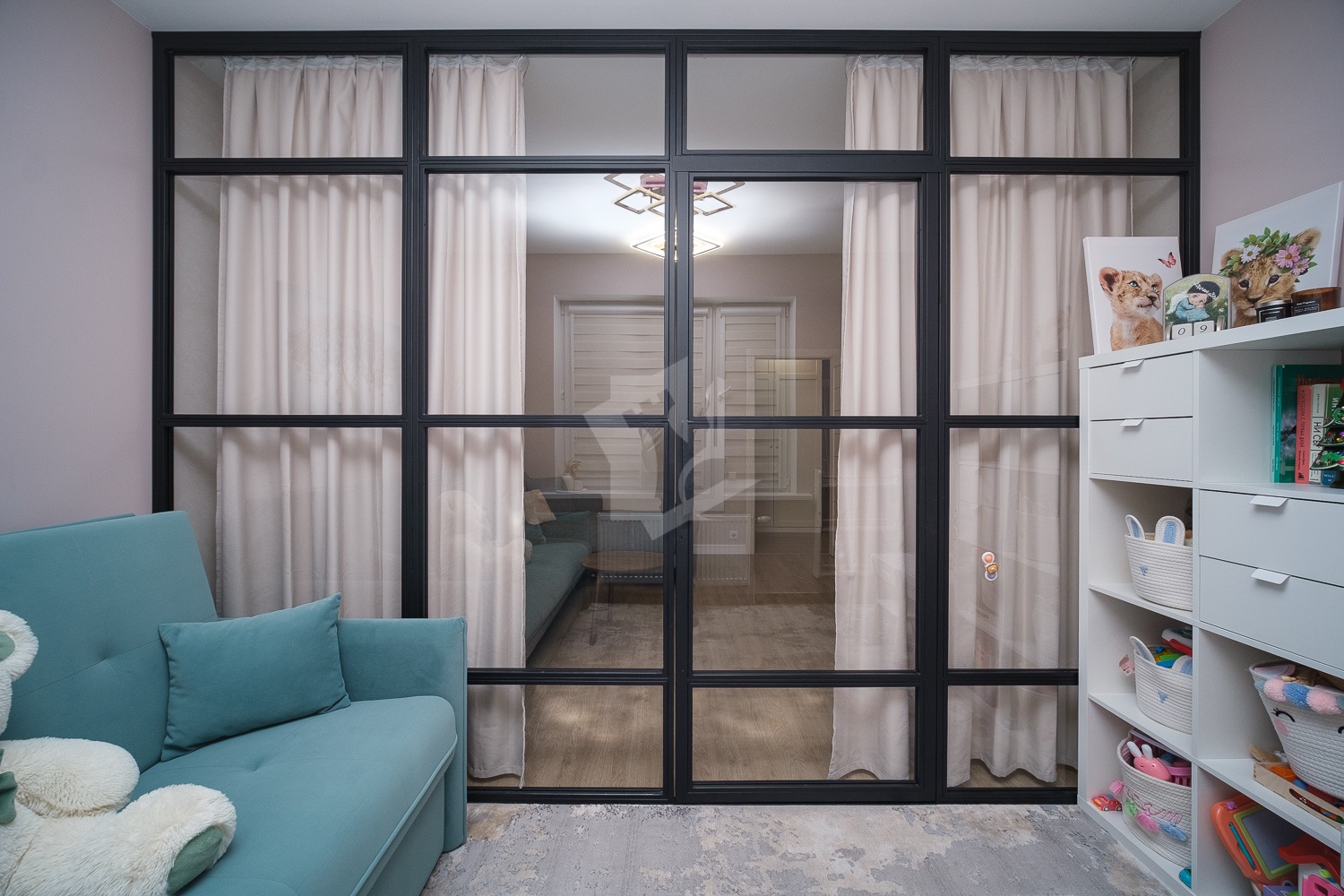 Продуманное зонирование пространства, стеклянная перегородка с эффектом звукоизоляции.