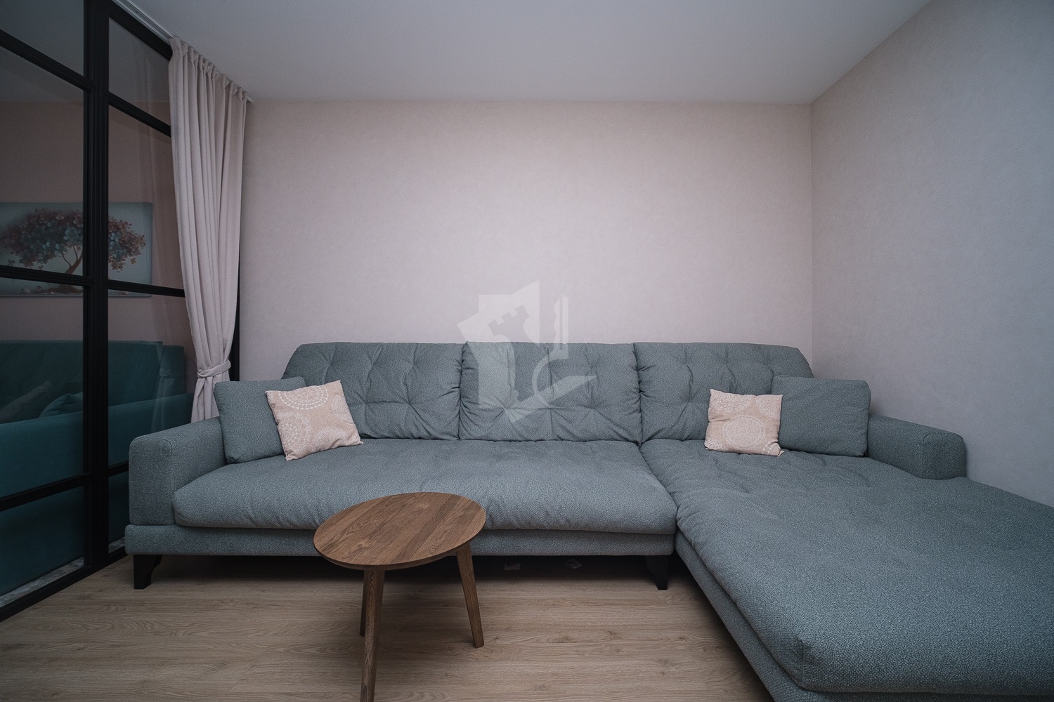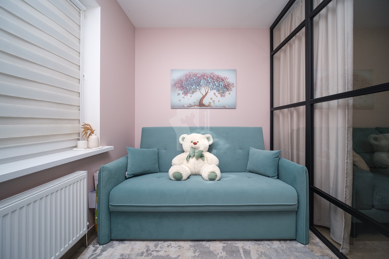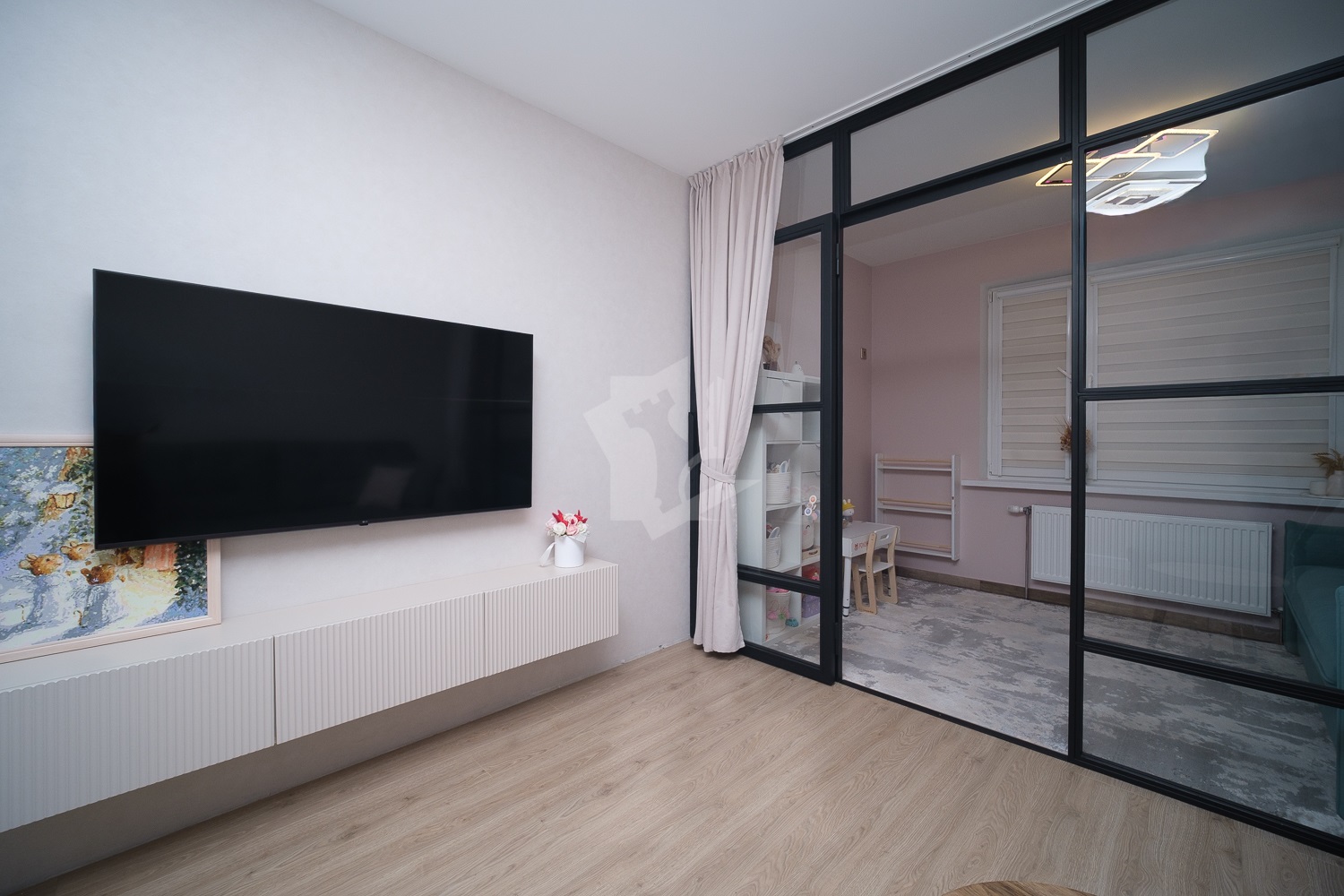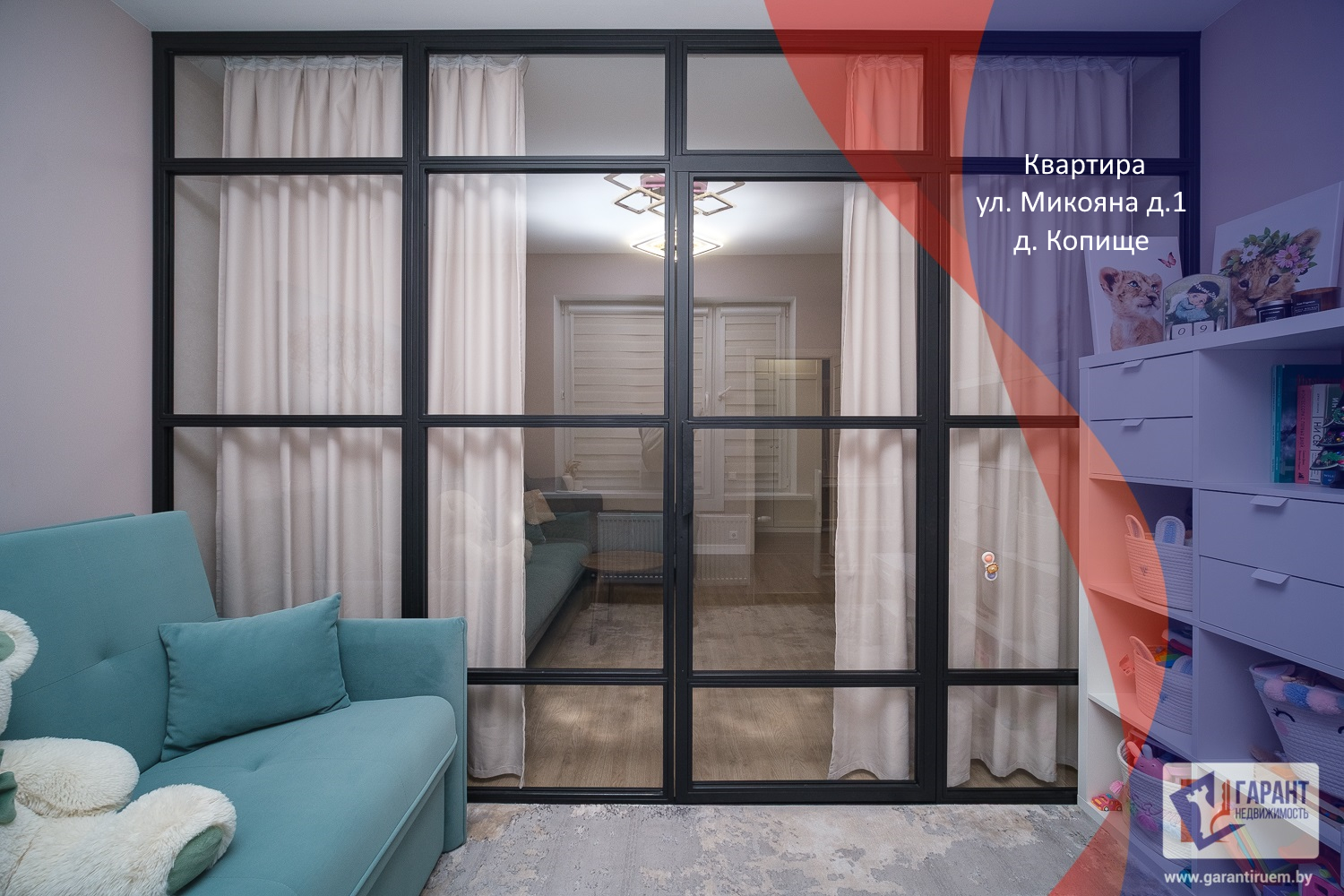 Продуманное зонирование пространства, стеклянная перегородка с эффектом звукоизоляции.