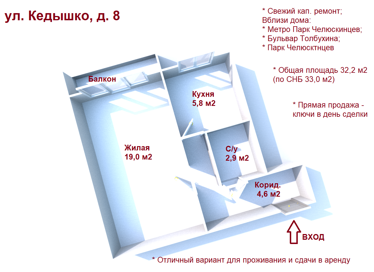 Площадь: 33.0 (СНБ) / 32.2 (общая) / 19.0 (жилая) / 5.8 (кухня).