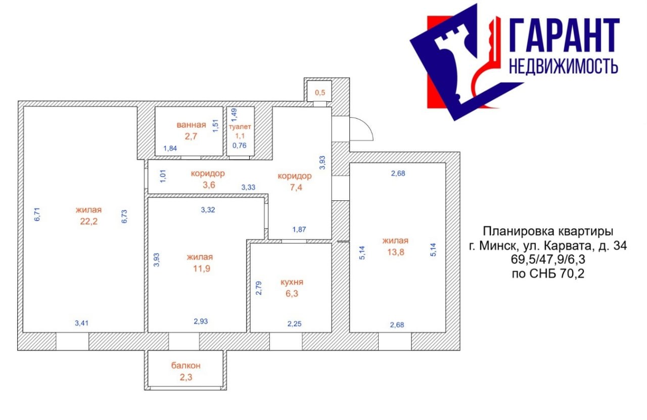 69,5 м2 (по СНБ – 70,2 м2) общей площади, включая 47,9 м2 жилой зоны