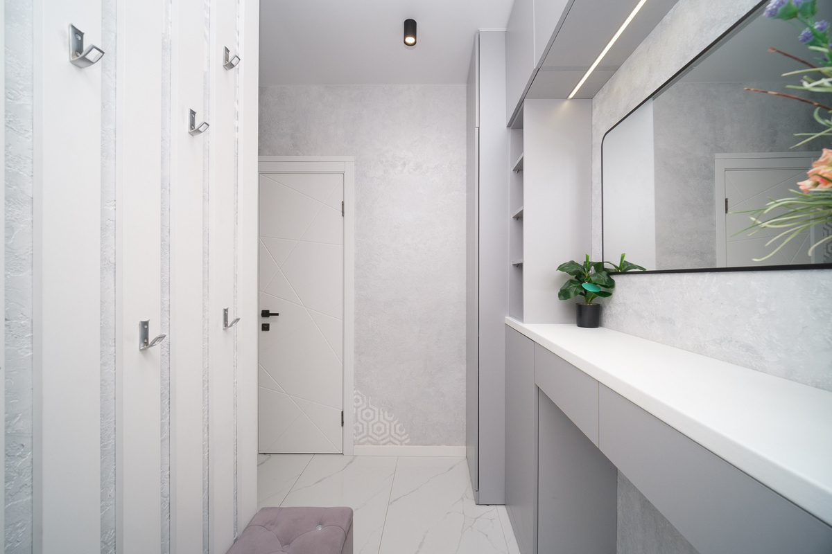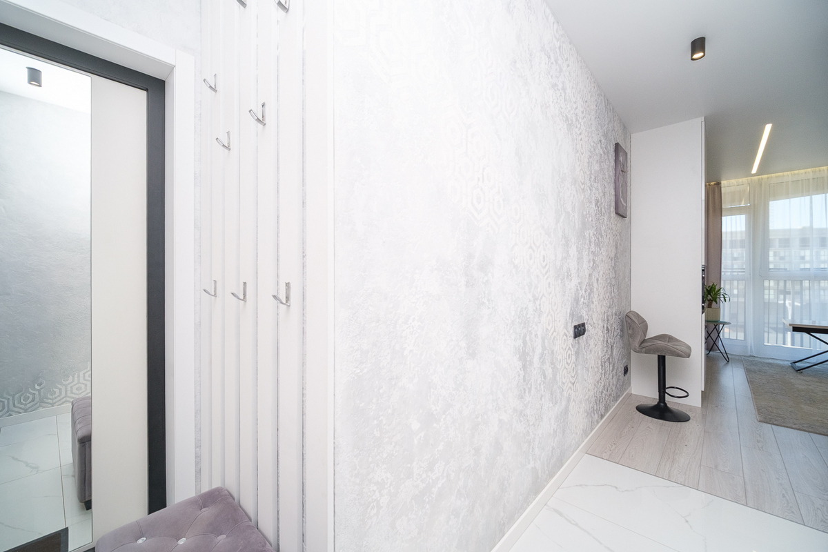 · Вместительный шкаф для верхней одежды и открытые вешалки при входе создают уют и функциональность.
